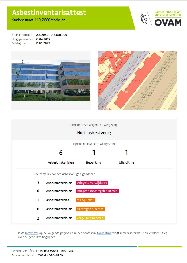 Het asbestattest is een verplicht document van de OVAM om aan te tonen of er asbest aanwezig is in een pand dat wordt verkocht. In het attest staat onder andere de toestand van het asbest beschreven en welke materialen of gebouwonderdelen het asbest (kunnen) bevatten. Bovendien bevat het attest ook advies over hoe het veilig kan worden beheerd of verwijderd.