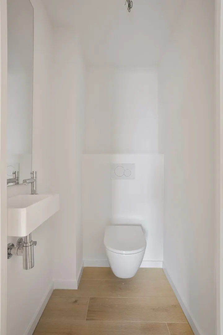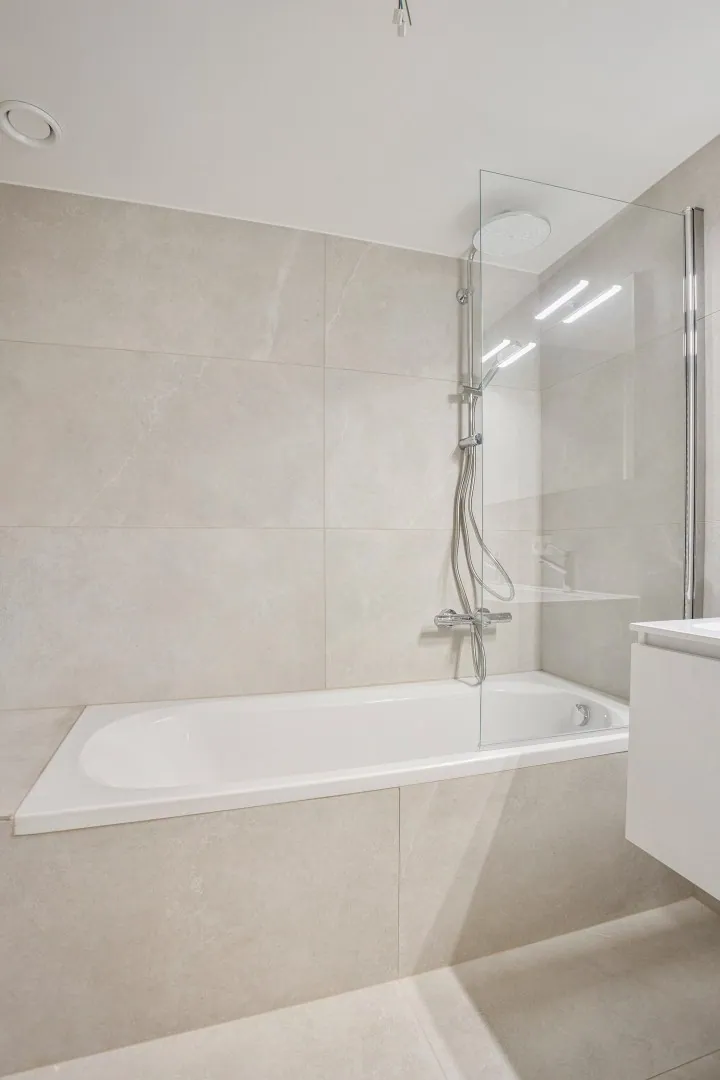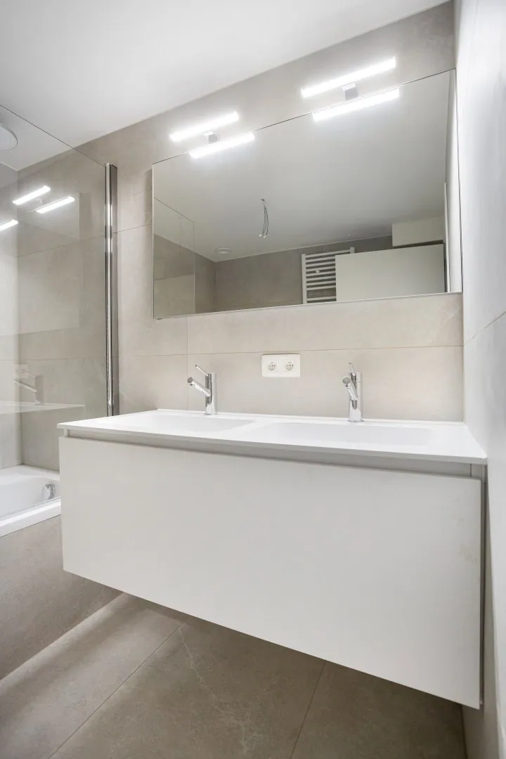 De badkamer heeft naast de dubbele lavabo ook een ligbad met douche. De ruime berging is voorzien van de nodige aansluitingen voor een wasmachine en een droogkast.