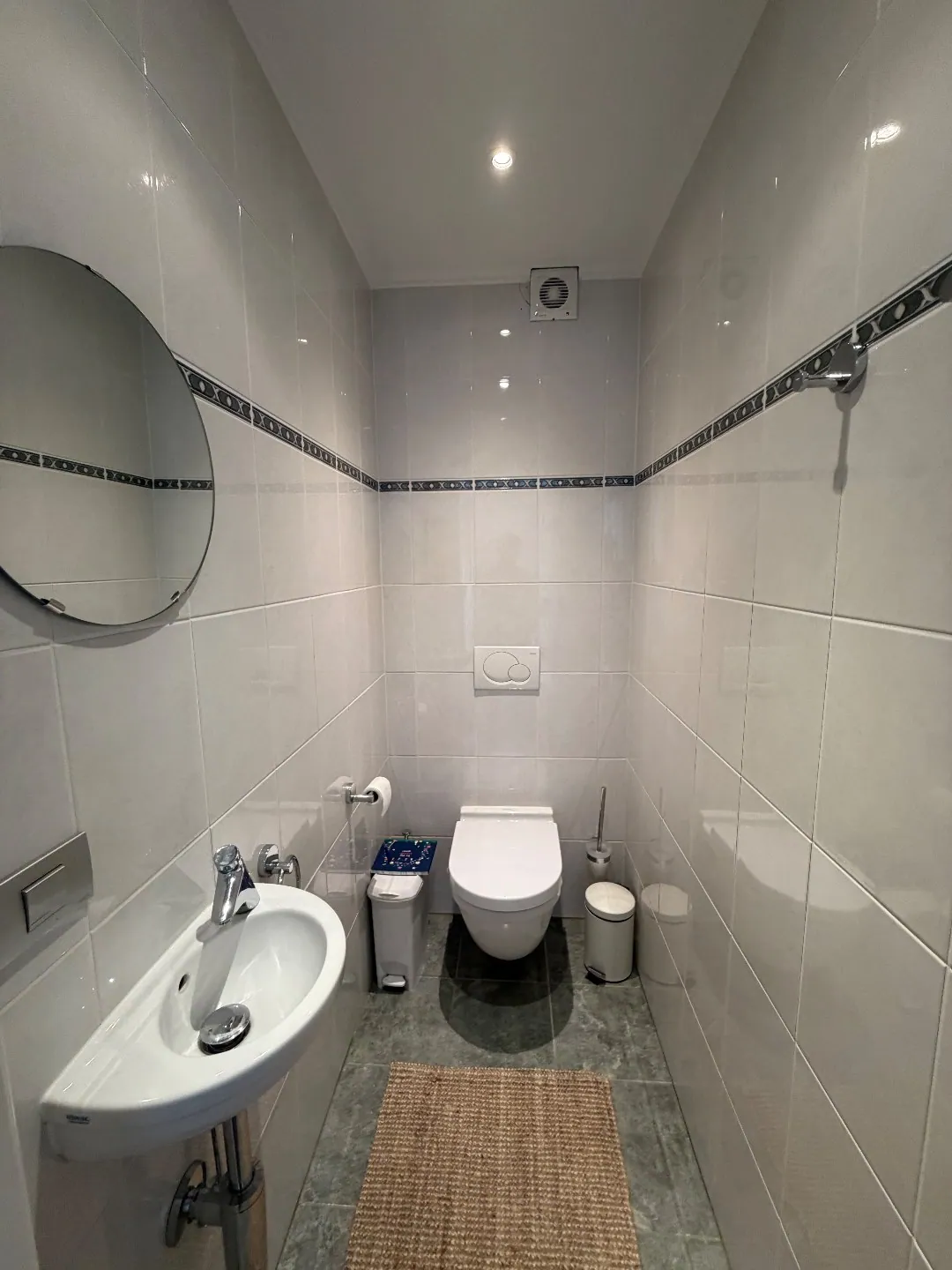 - Ruime badkamer, uitgerust met lavabo, toilet en ligbad