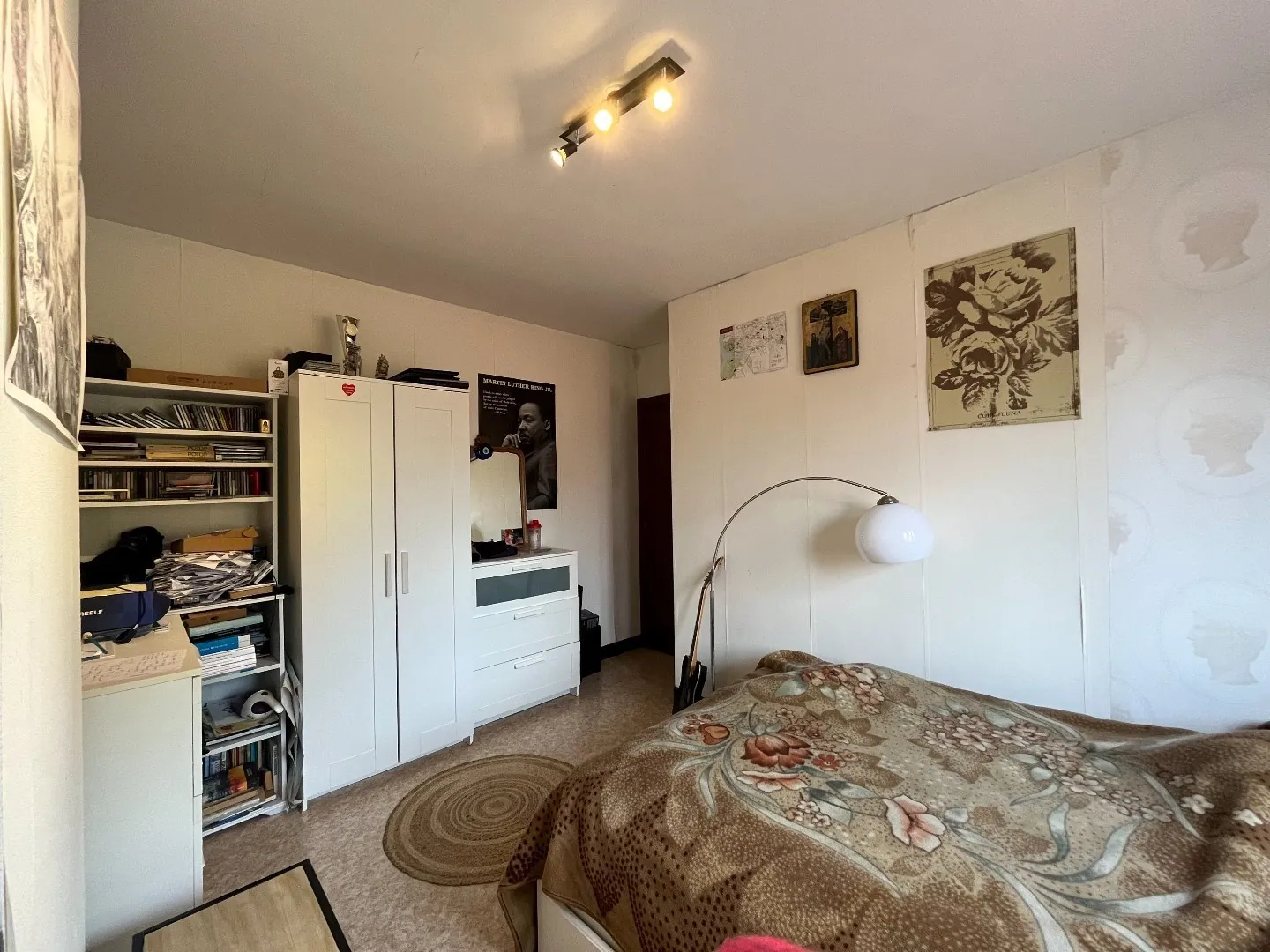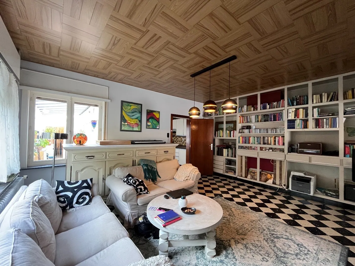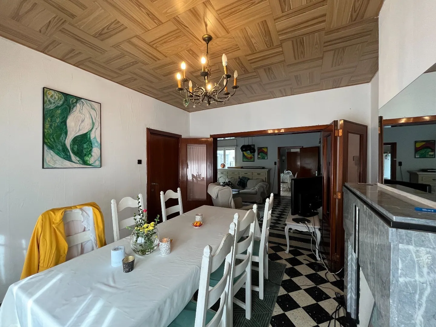 We betreden het pand via de inkomhal. Deze biedt toegang tot de leefruimte. In de leefruimte is er een aangenaam salon met gigantische wandkast en ruime eetplaats. Beide plaatsen baden in het licht dankzij de grote raampartijen.