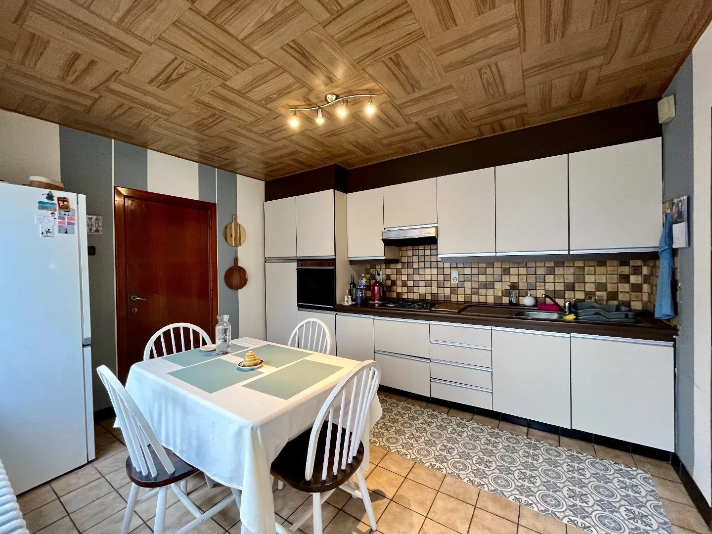 De afzonderlijke keuken is ingericht met kasten en alle nodige toestellen. Deze ruimte is groot genoeg om nog een eettafel te voorzien. Achteraan de keuken is er een wasplaats/berging.