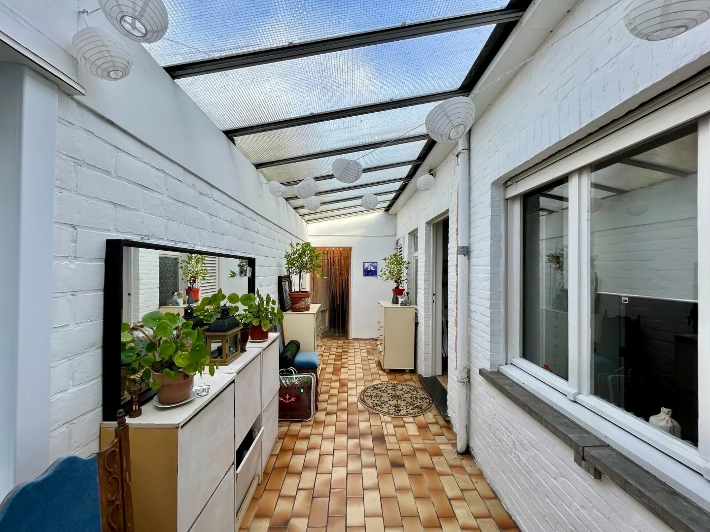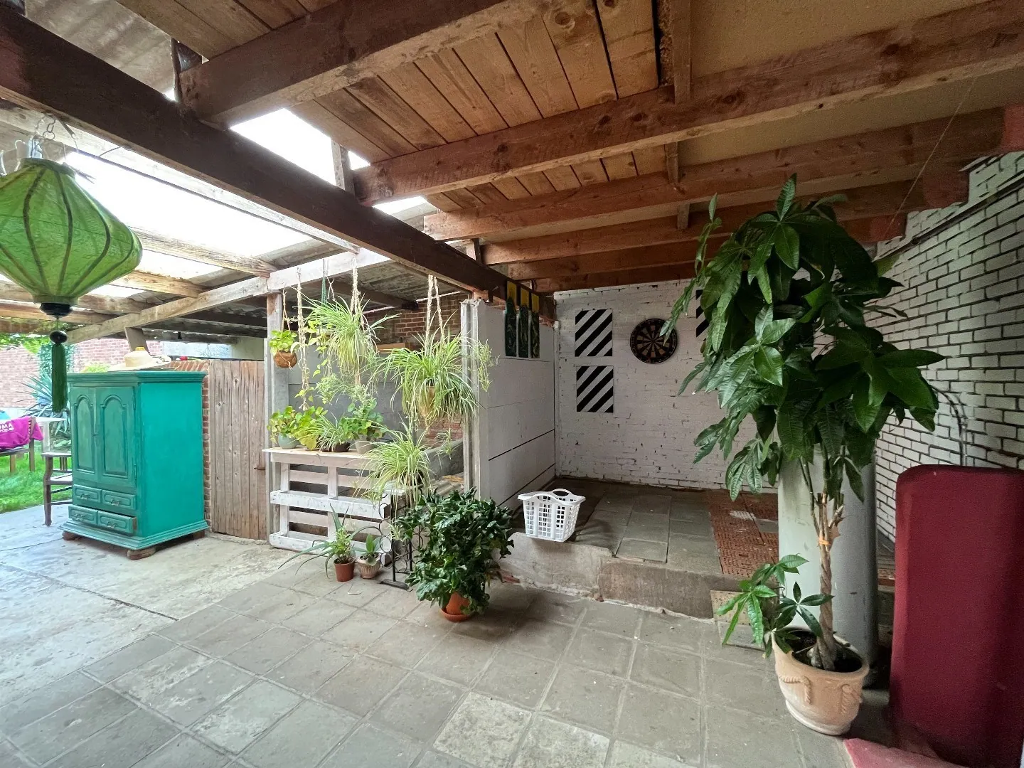 Wanneer we naar de tuin gaan is er eerst een overdekte plaats, momenteel leuk aankleed met planten, waar het gezellig vertoeven is.