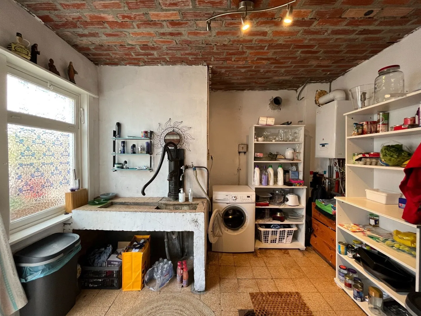 Tegen de achtergevel, aansluitend bij keuken en wasplaats, is er een veranda die heel wat bergruimte biedt.