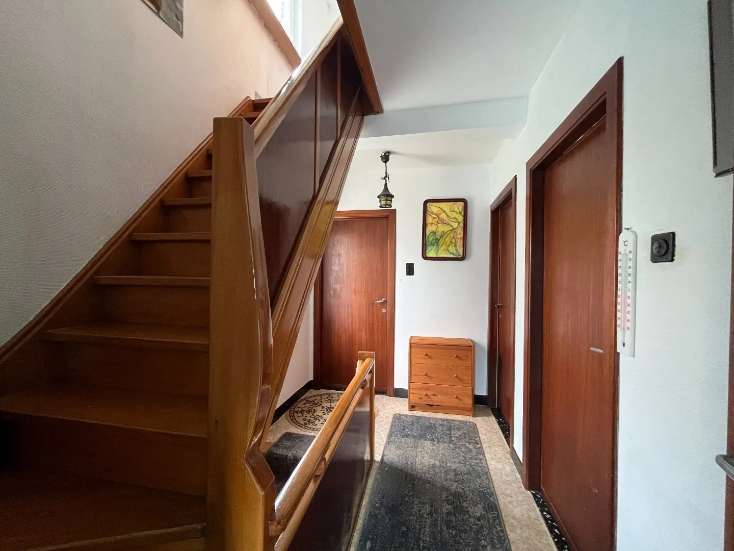Via de inkomhal bereiken we langs de vaste trap de eerste verdieping. Hier situeren zich 3 volwaardige slaapkamers en een badkamer.