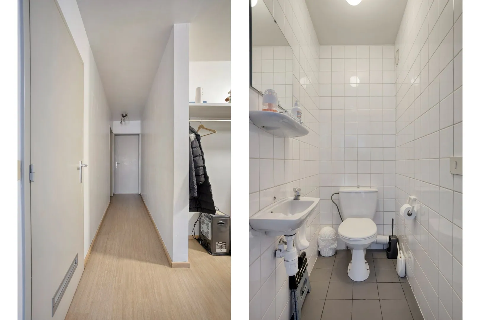 Via de inkomhal met vestiaire betreden we de ruime en lichtrijke leefruimte van bijna 50m². Aanpalend bevindt zich de goed uitgeruste keuken met ontbijthoek. De nachthal brengt ons bij 3 volwaardige slaapkamers alsook bij de badkamer, de wasplaats en het aparte toilet. De badkamer beschikt over een dubbele wastafel en een ligbad met douche. Als extra troef is er vooraan een balkon met zicht op de winkelstraat én achteraan een gezellig terras met uitzicht op het groen. Achterliggend is er nog een bergzolder voorzien.