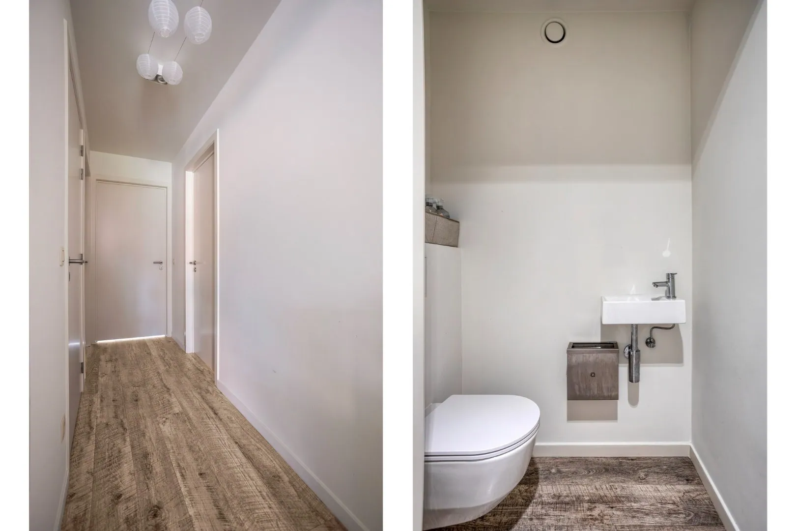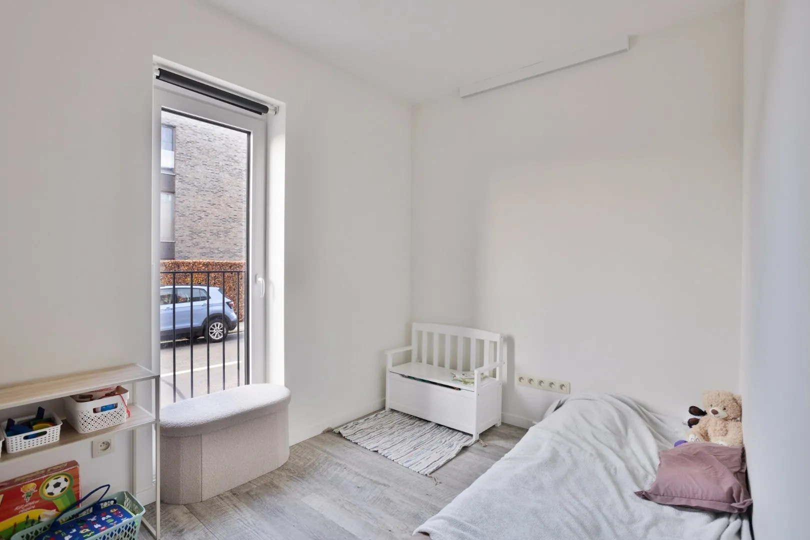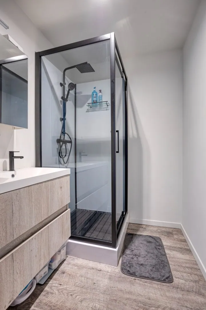 We betreden het appartement via de open leef- en eetruimte die uitzicht geeft op het terras. Gevolgd door een open keuken. Achter de keuken is er nog een wasplaats/technische ruimte aanwezig. Verder beschikt het appartement over 2 volwaardige slaapkamers van 15 en 9 m². Naast de slaapkamer vinden we de praktisch ingedeelde badkamer met dubbele wastafel en douche terug. Tot slot werd er nog een apart gastentoilet voorzien.