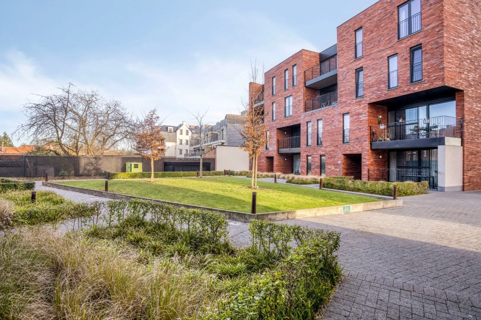 Het groot terras geeft zicht op een goed onderhouden binnentuin waar het heerlijk vertoeven is.