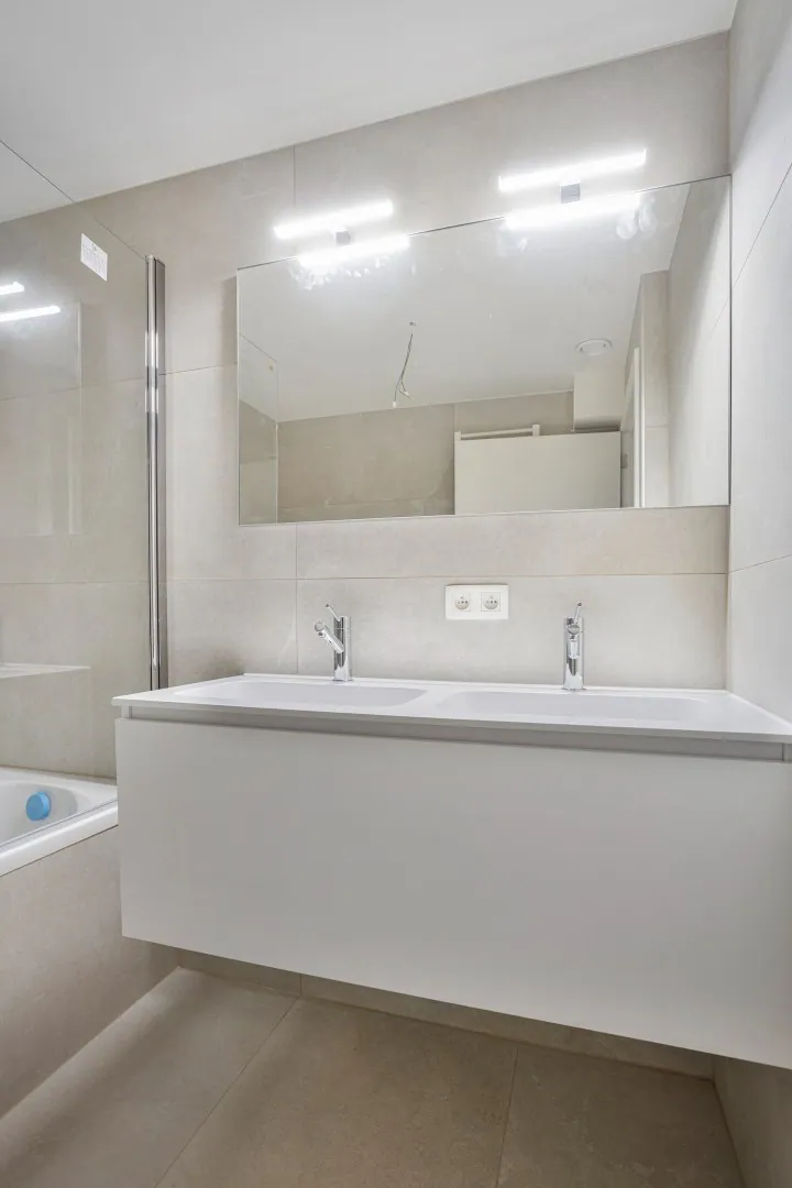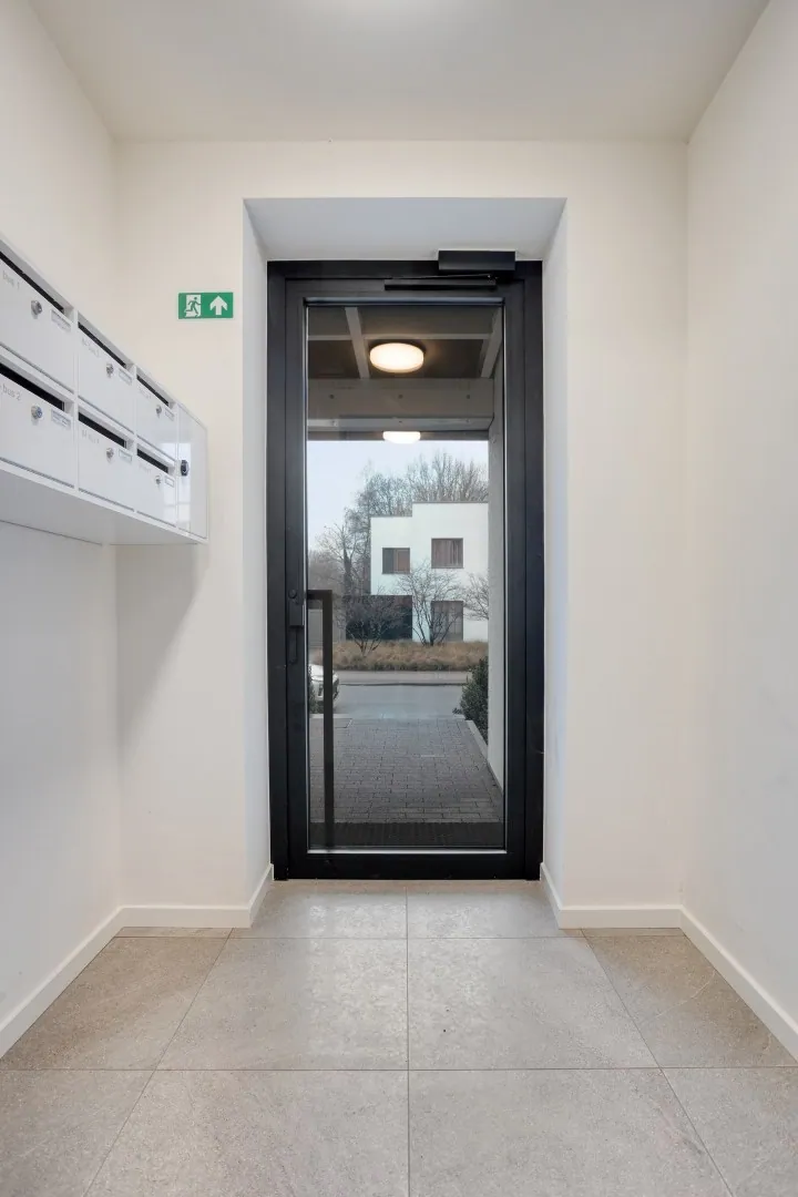 Het appartement op de gelijkvloerse verdieping is toegankelijk via de gemeenschappelijke inkomhal. Bij het betreden kom je meteen uit in de leef- en eetruimte met vooraan een zuid-west oriëntatie. De volledig uitgeruste open keuken heeft een groot aanrecht. De nachthal met bureau en ingebouwde kast brengt je naar twee volwaardige slaapkamers, de badkamer en het aparte toilet. De badkamer heeft naast de dubbele lavabo ook een ligbad met douche. De ruime berging is voorzien van de nodige aansluitingen voor een wasmachine en een droogkast.