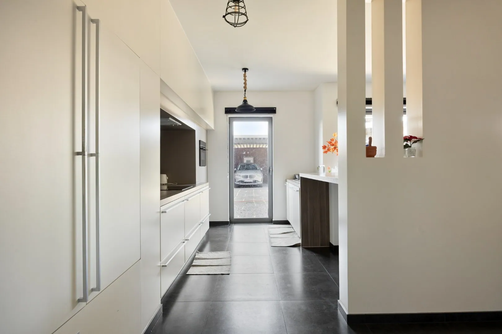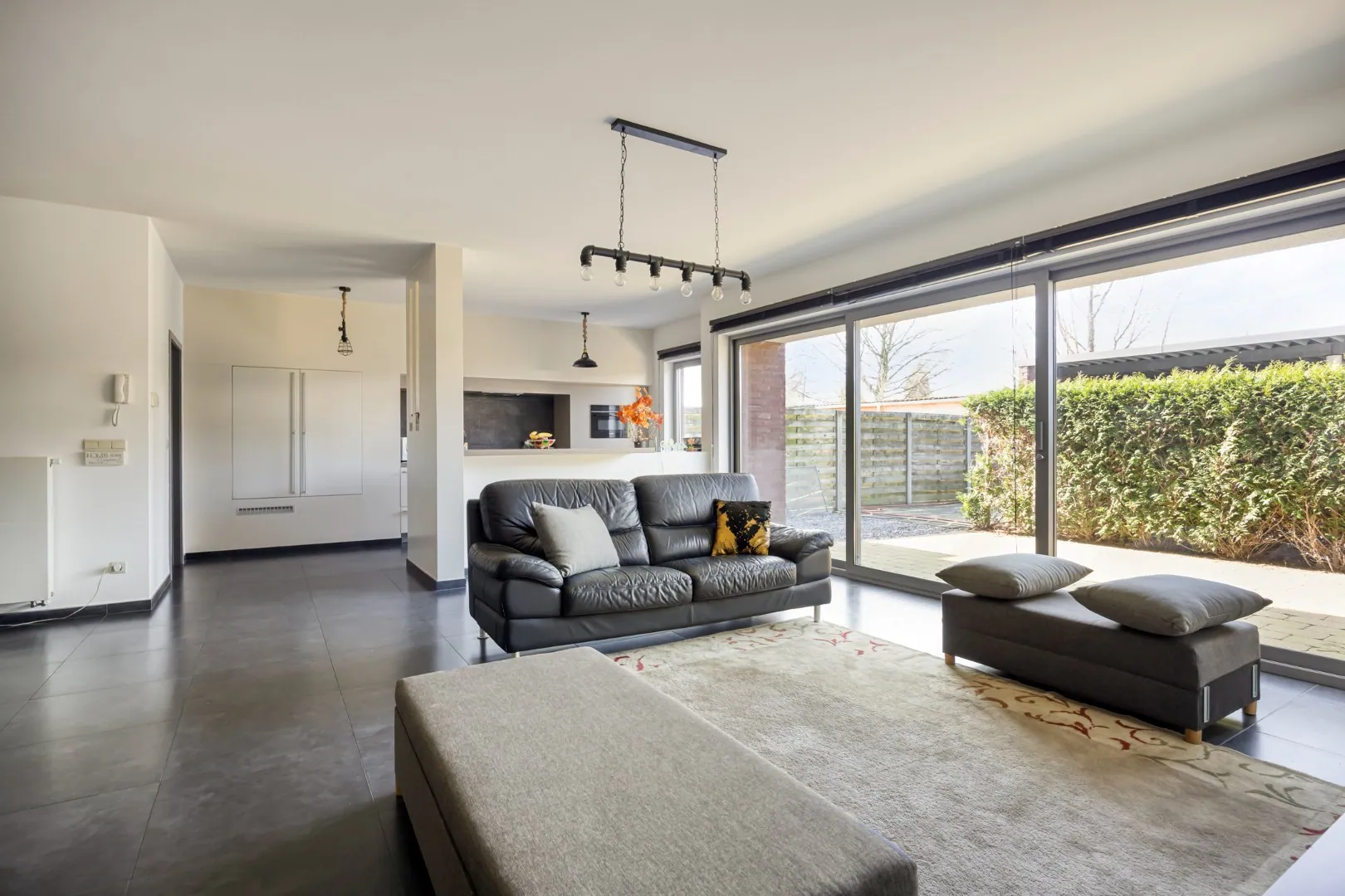 Via de inkomhal met vestiaire en apart toilet betreden we de zeer ruime en lichtrijke leefruimte met een volledig uitgeruste open keuken en ontbijthoek. Achterliggend is er een praktische voorraadberging/wasplaats voorzien. Aanpalend aan de leefruimte is er een ruim terras waar het heerlijk vertoeven is, bereikbaar via een schuifraam.