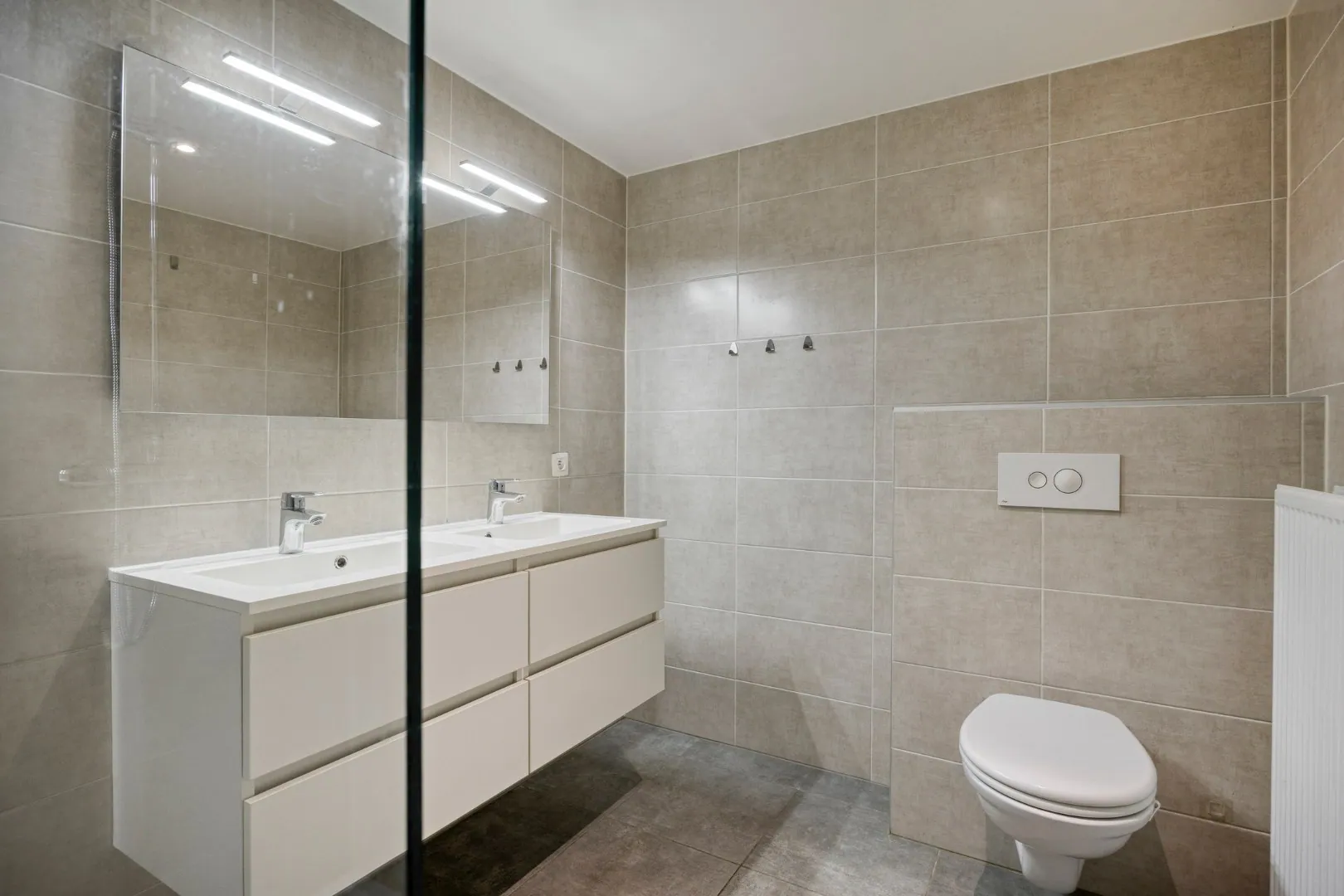 Via de ruime inkomhal betreden we het appartement. Deze verleent toegang tot het gastentoilet, de praktische berging/wasplaats met aansluitingen voor wasmachine en droogkast, de badkamer met inloopdouche, dubbele lavabo en een tweede toilet, en de lichtrijke woonkamer met open, volledig uitgeruste keuken. Vanuit de leefruimte bereik je het gezellig overdekte terras. Het appartement beschikt daarnaast over drie volwaardige slaapkamers.
