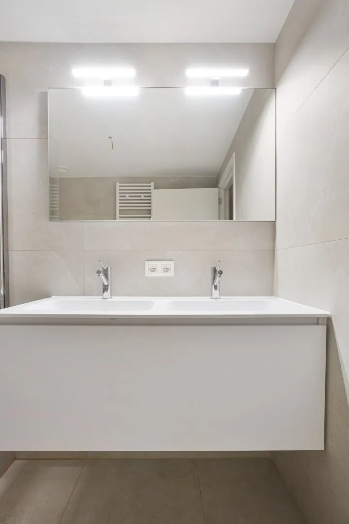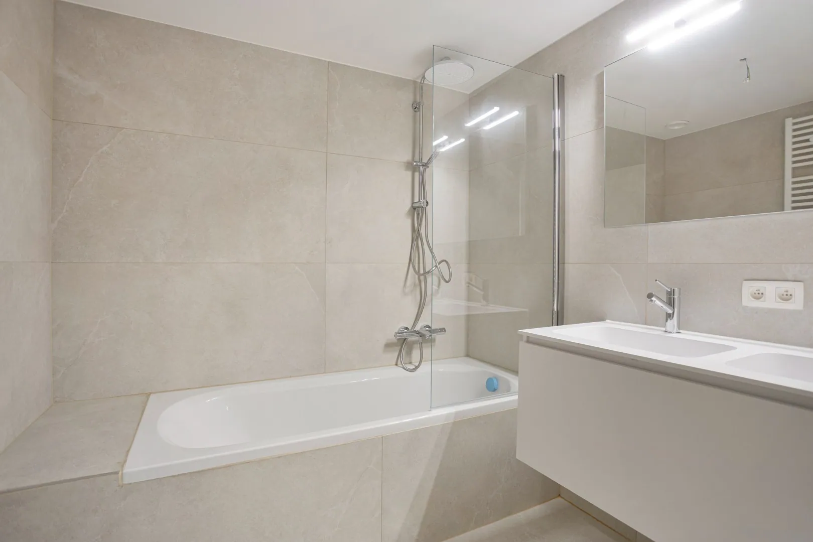 De badkamer heeft naast de dubbele lavabo ook een ligbad met douche. De ruime berging is voorzien van de nodige aansluitingen voor een wasmachine en een droogkast.