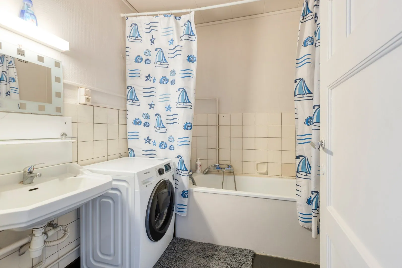 Het appartement is gelegen op de derde verdieping en verwelkomt ons via een ruime inkomhal. Van hieruit is er toegang tot twee ruime slaapkamers, de badkamer uitgerust met wastafel, ligbad, toilet en aansluitingen voor een wasmachine, en de lichtrijke woonkamer. Aansluitend bevindt zich de keuken, die toegang biedt tot het terras.