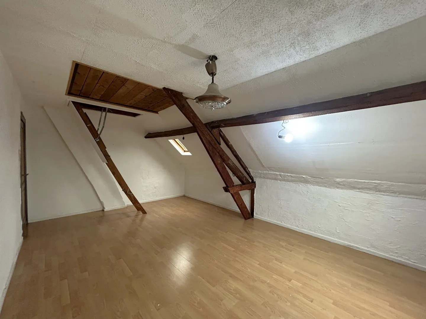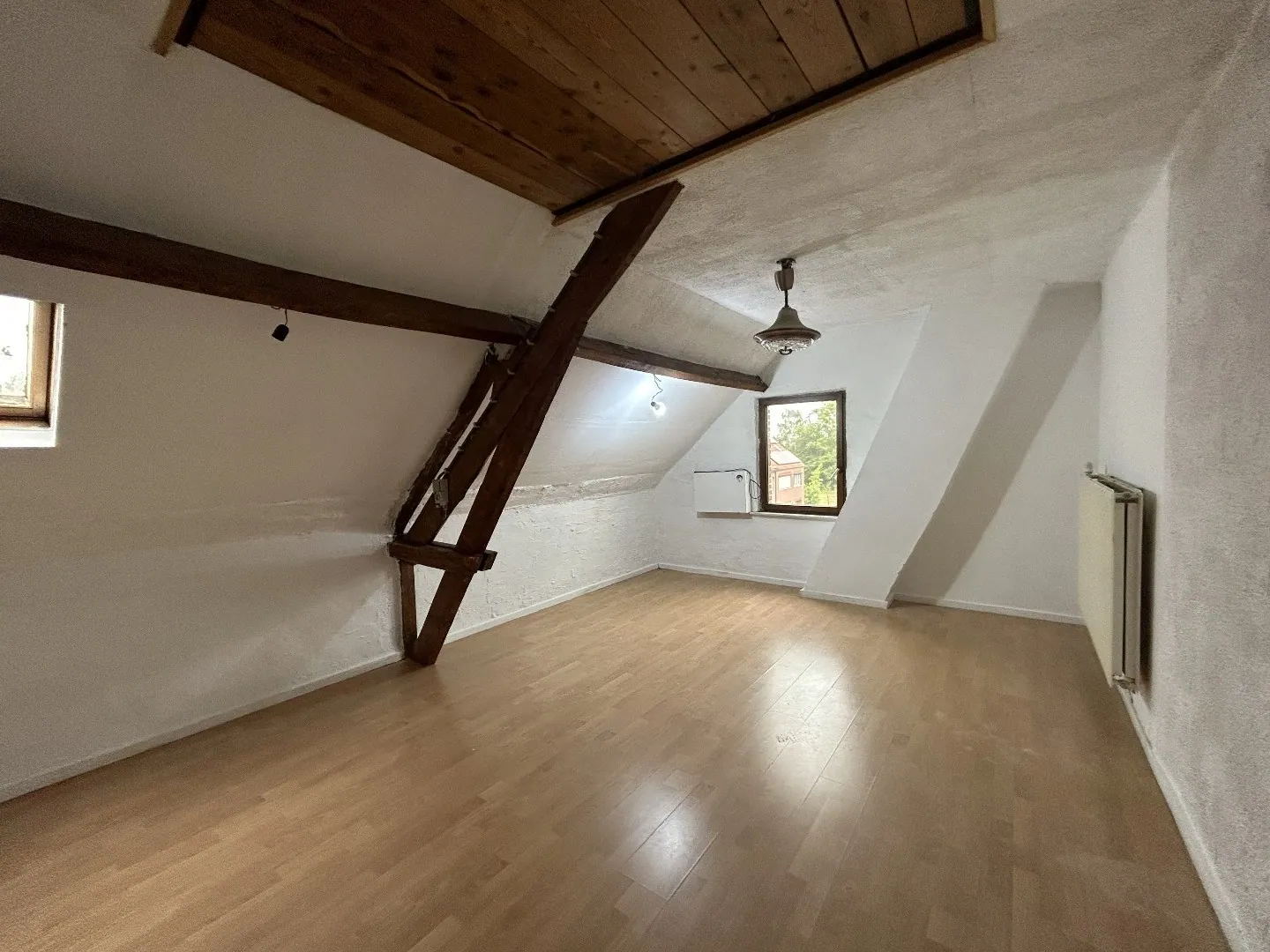 De trap in de gemeenschappelijke inkomhal brengt ons via de hal bij de keuken met ontbijthoek en aanpalende living. Verder beschikken we hier nog over een badkamer om vervolgens via de vaste trap de 2e verdieping te bereiken waar we nogmaals 2 volwaardige slaapkamers terugvinden. De tweede slaapkamer beschikt nog over een valtrap dewelke toegang biedt tot een bergzolder.