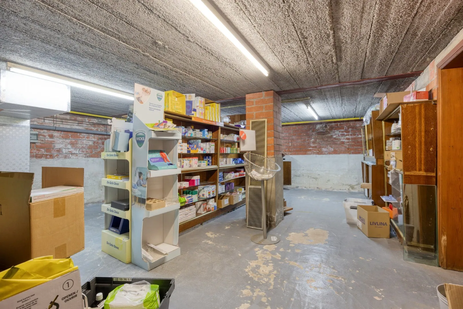 Het gelijkvloers doet momenteel dienst als apotheek en bestaat uit de apotheekruimte, bereidingsruimte, bureau, leefruimte met kitchenette en toilet. Via de apotheek is ook de ruime kelder van 123 m² bereikbaar, die zeer veel opbergruimte biedt.