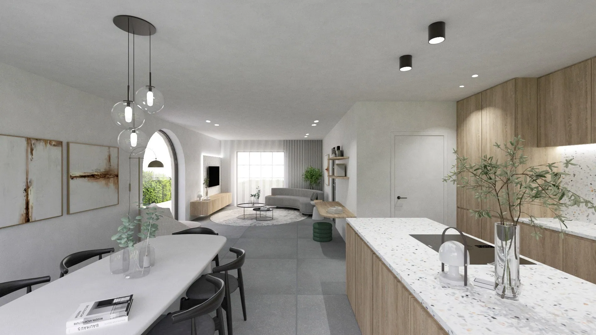 We betreden deze ruime woning via de inkomhal met vestiaireruimte en apart gastentoilet. Vervolgens komen we terecht in de lichtrijke leef- en eetruimte, dewelke naadloos overgaat in de volledig uitgeruste, open keuken. Vanuit de open ruimte betreden we het terras, waar het heerlijk vertoeven is dankzij de gunstige oriëntatie.