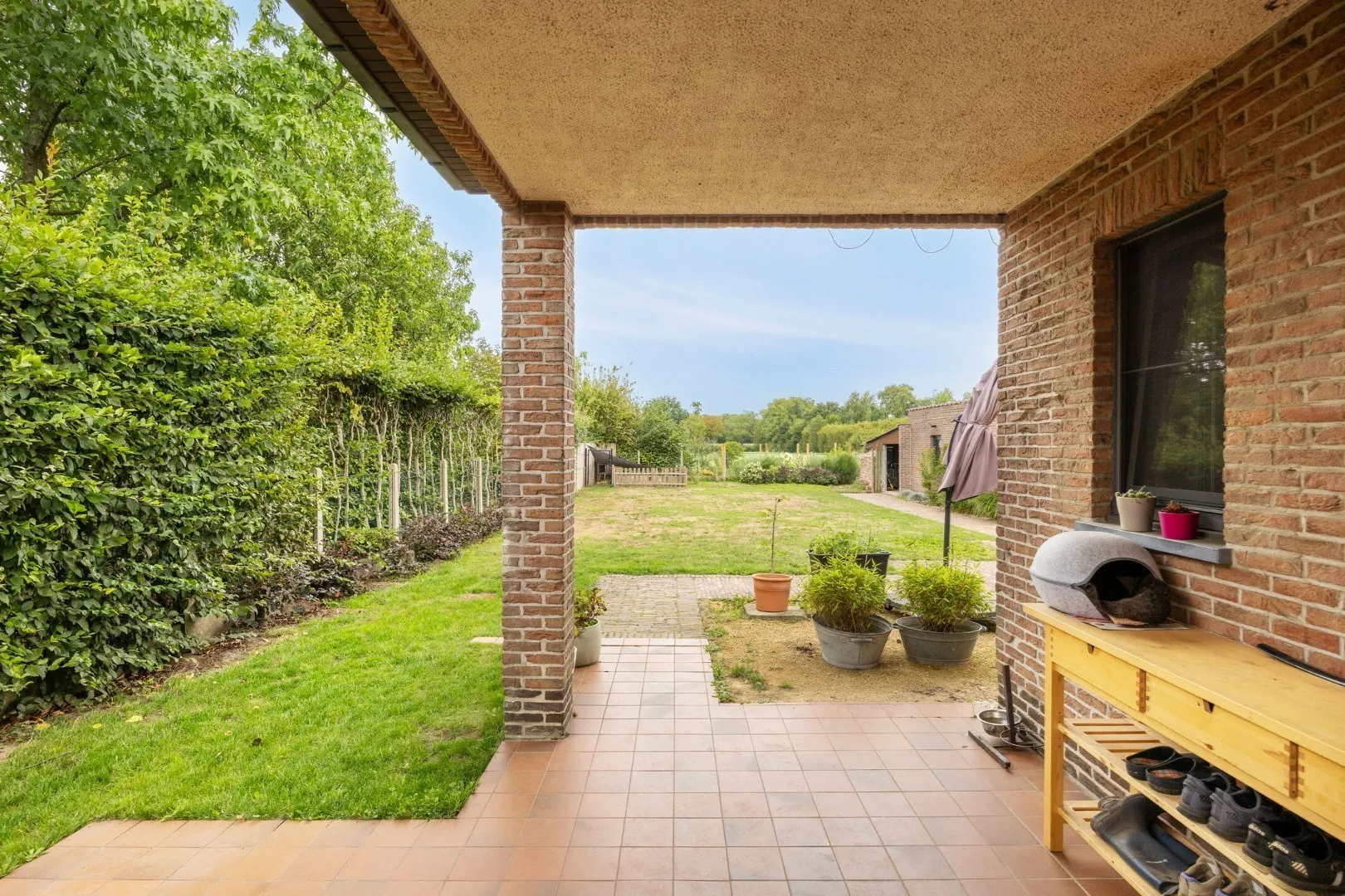 Achteraan de woning is er een volledig omheinde tuin, waar 100% privacy gegarandeerd is. De tuin is netjes aangelegd en beschikt over een terras met een vrij uitzicht op de velden. Tot slot is er een ruime garage met elektrische poort.