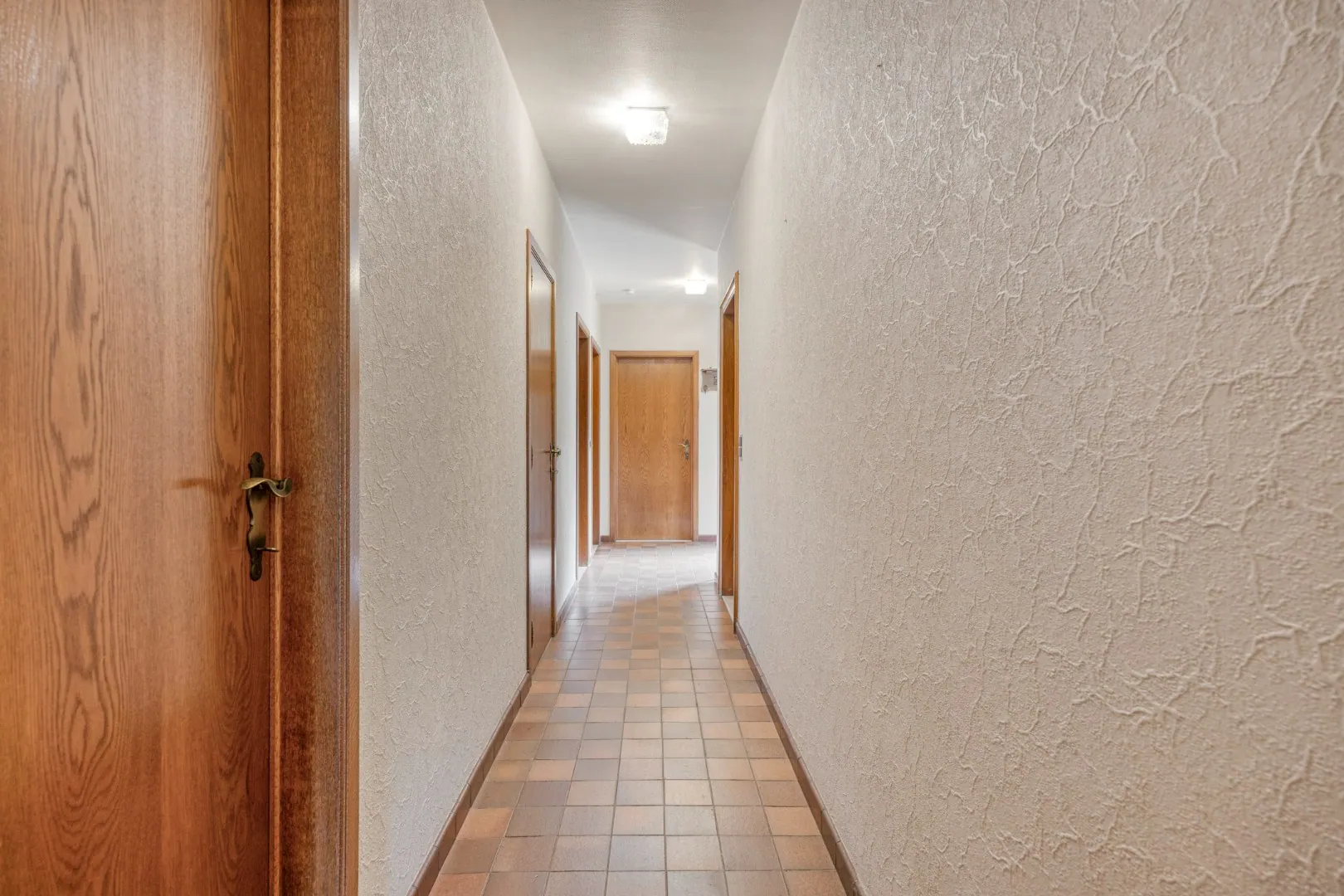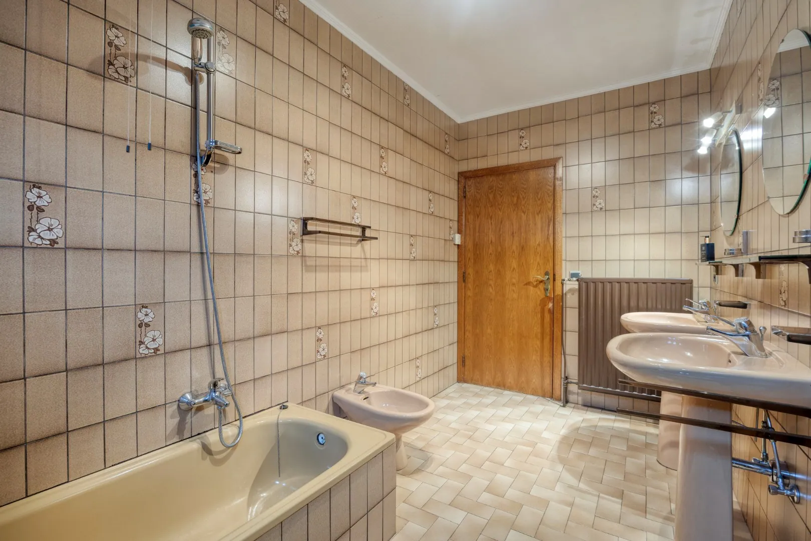 Via de nachthal bereiken we drie volwaardige slaapkamers, een praktische berging met aansluitingen voor wasmachine en droogkast, en een badkamer uitgerust met een ligbad en dubbele wastafel.
