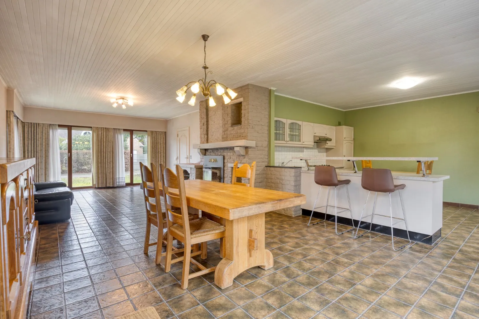 We betreden de woning via de inkomhal met apart gastentoilet. Aansluitend komen we in de ruime en lichtrijke leef- en eetruimte, waar de houtkachel zorgt voor een warme en gezellige sfeer. De volledig uitgeruste open keuken sluit naadloos aan op de leefruimte en geniet van een mooi zicht op het zuidgerichte terras. Bovendien is er ruimte voorzien voor een gezellige ontbijthoek.