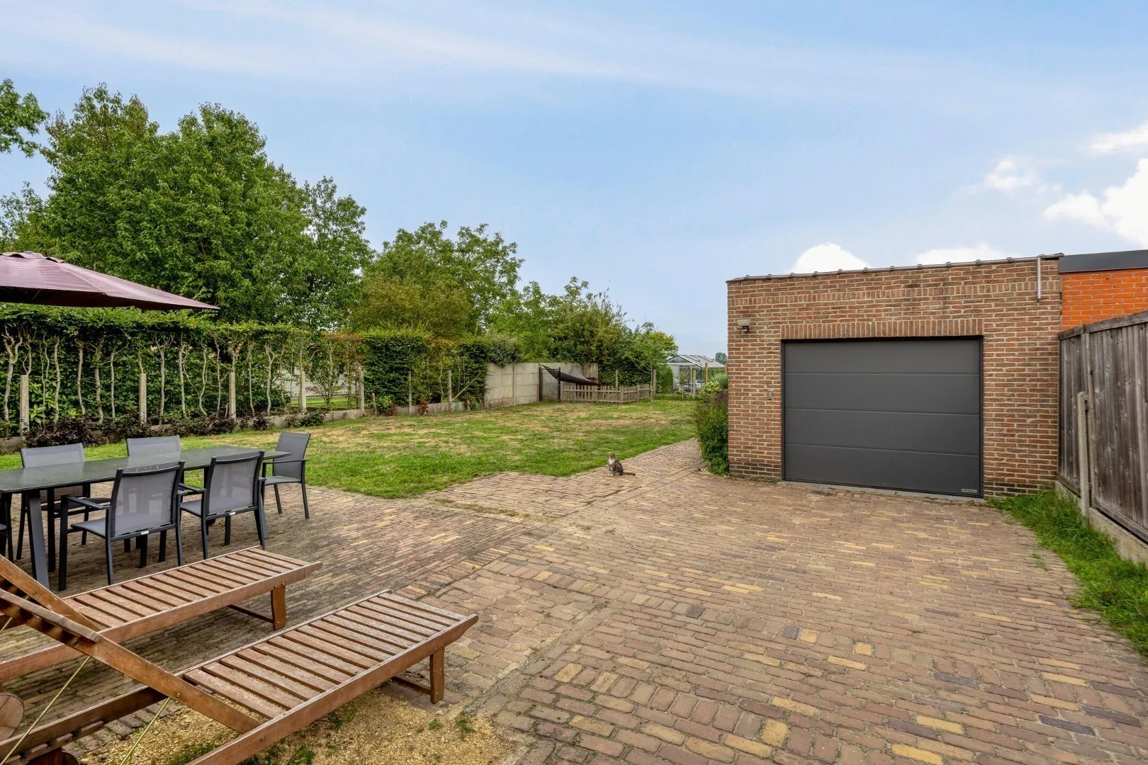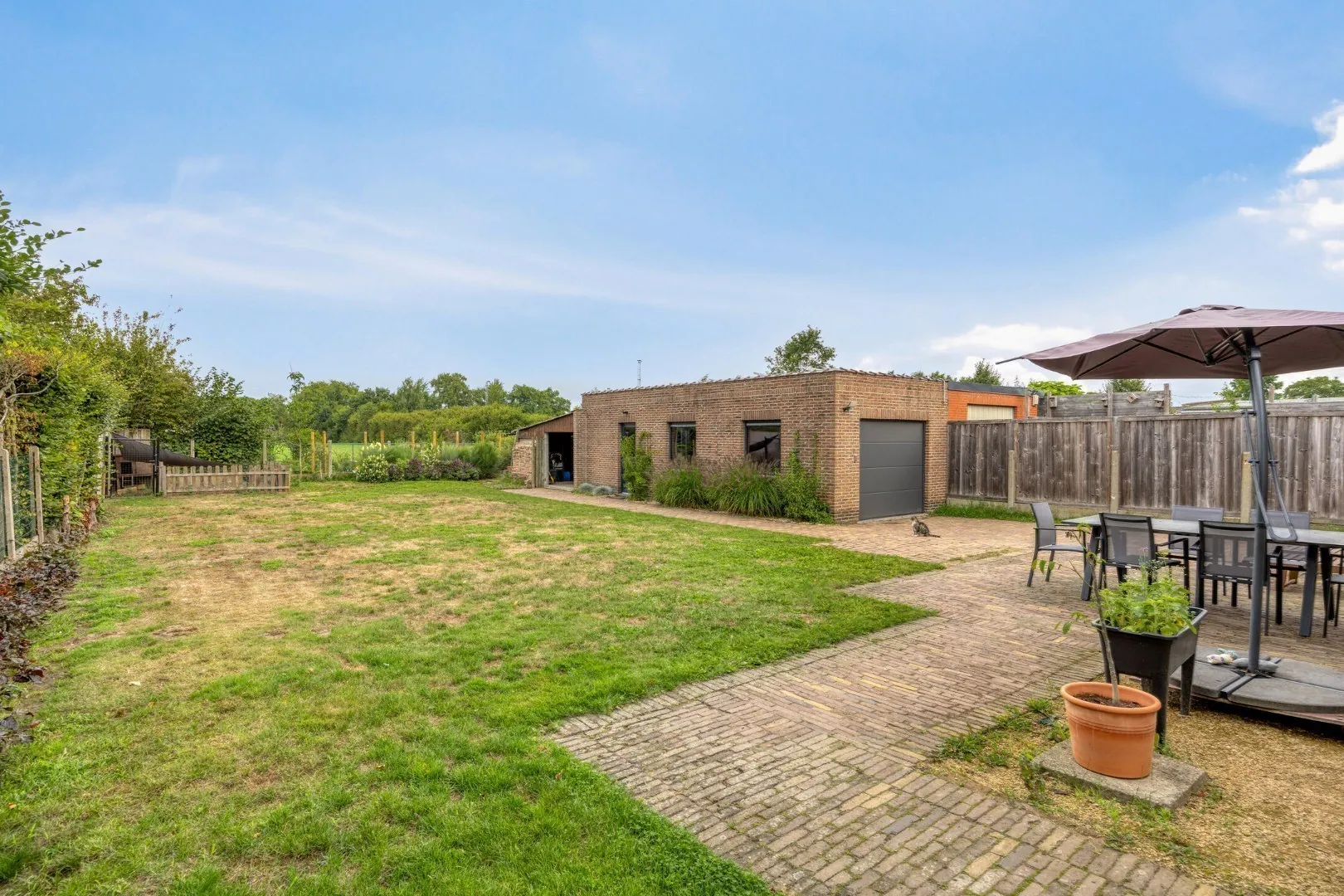 Achteraan de woning is er een volledig omheinde tuin, waar 100% privacy gegarandeerd is. De tuin is netjes aangelegd en beschikt over een terras met een vrij uitzicht op de velden. Tot slot is er een ruime garage met elektrische poort.