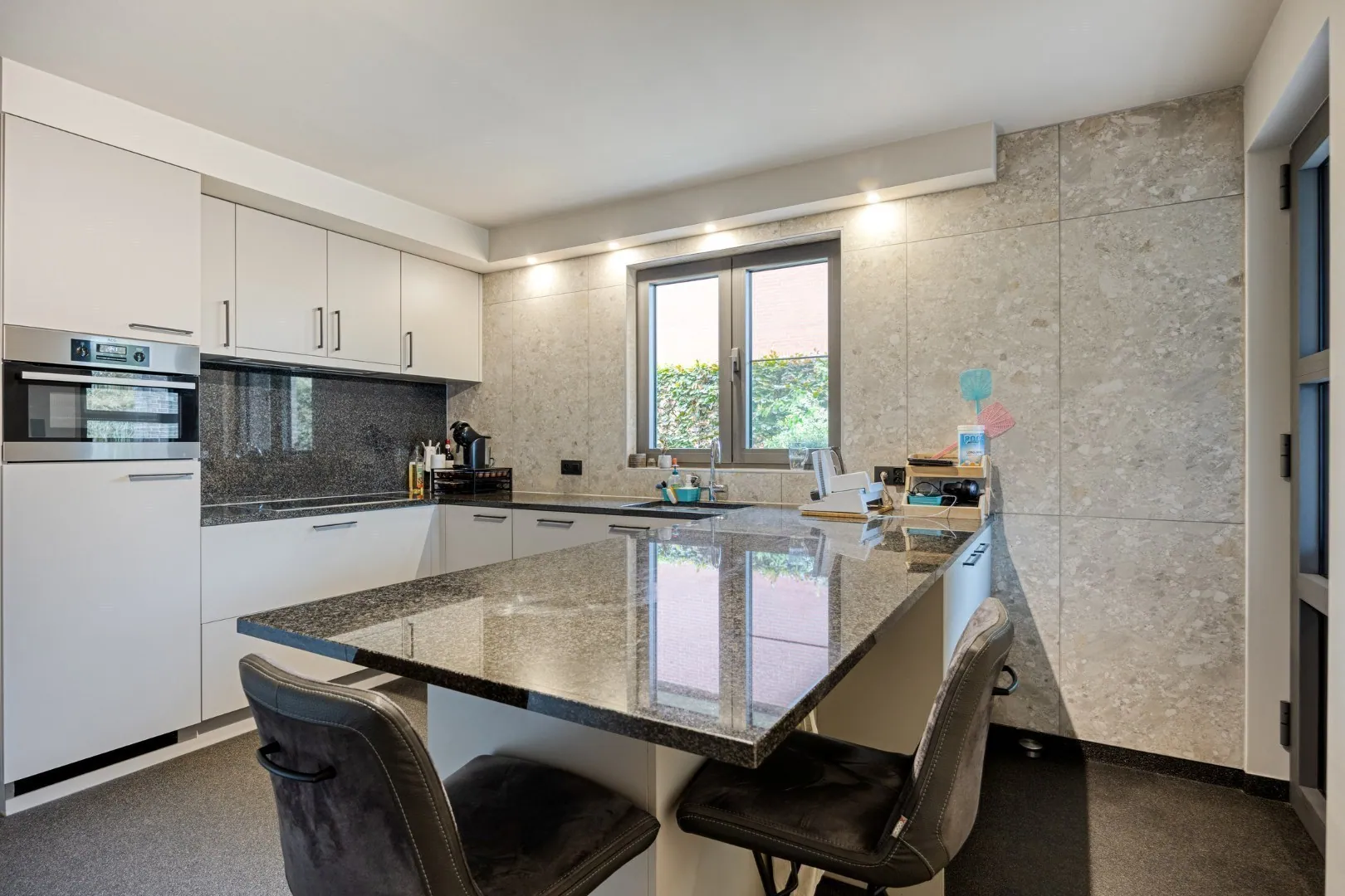 De inkomhal met apart toilet brengt ons meteen naar de grote en lichtrijke leefruimte. Deze biedt plaats voor een mooi salon, eetkamer en eventueel bureau-/hobbyruimte. De living gaat naadloos over naar de keuken. De moderne keuken is voorzien van alle nodige toestellen, beschikt over veel kastruimte en heeft een aangenaam zicht op de tuin. De gelijkvloerse verdieping heeft verder nog een grote slaapkamer met ingemaakte kast, een handige berging, een aparte douchekamer en een badkamer met dubbele lavabo.