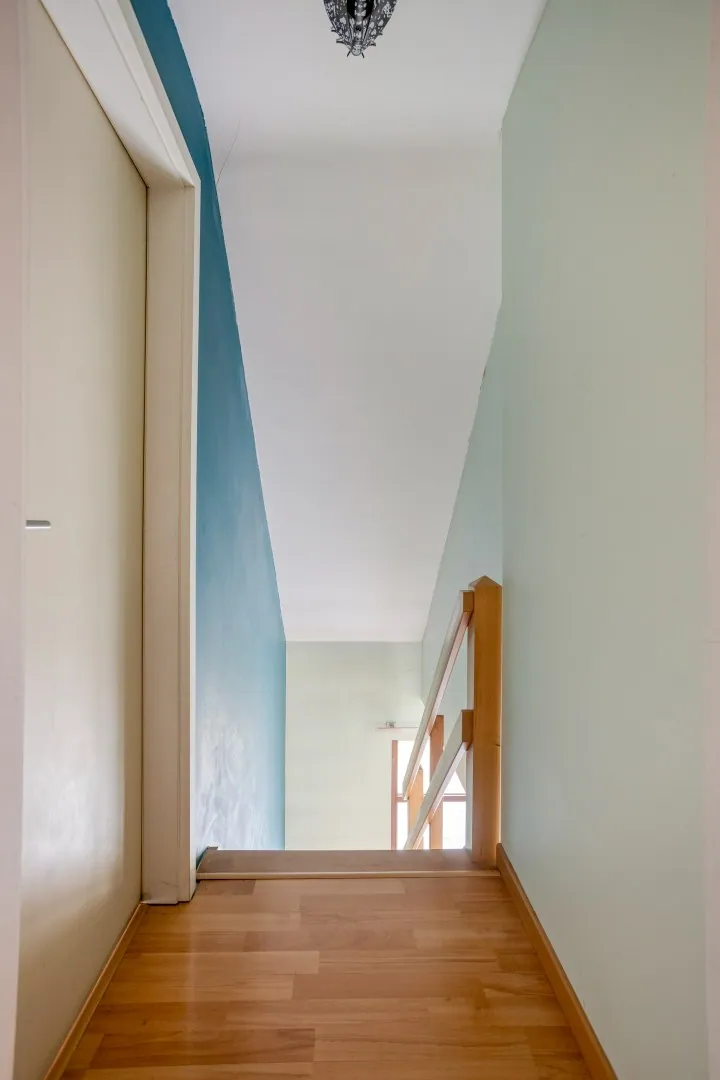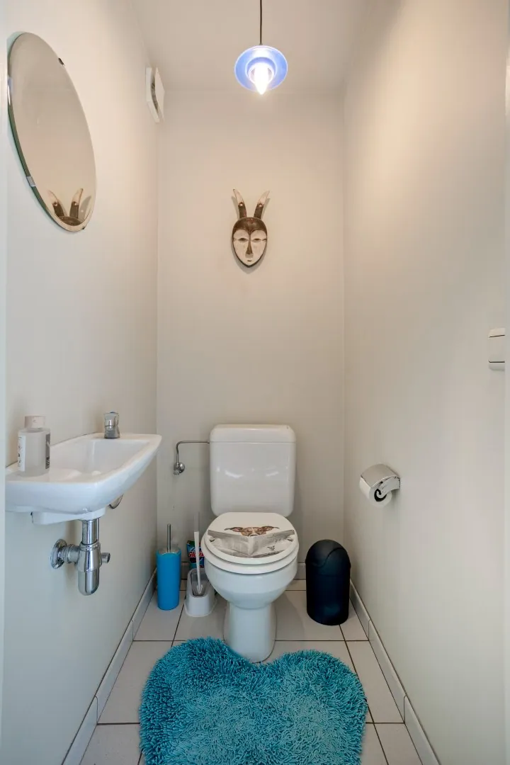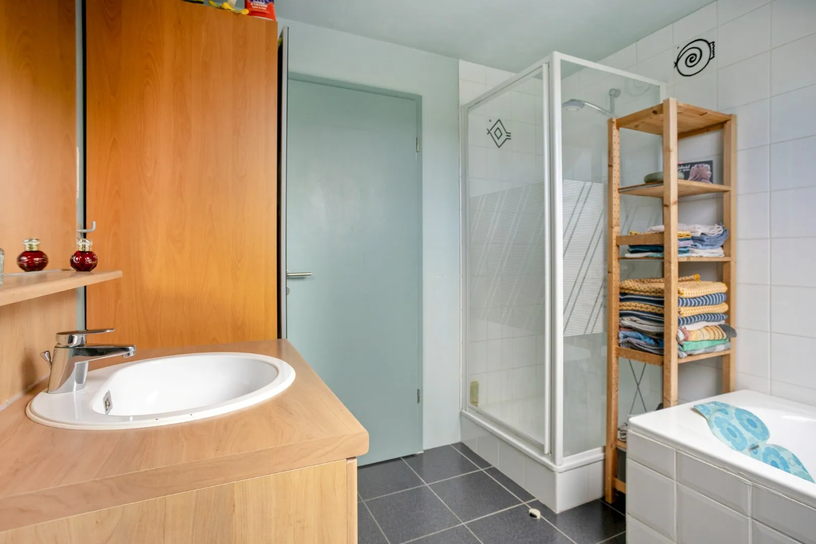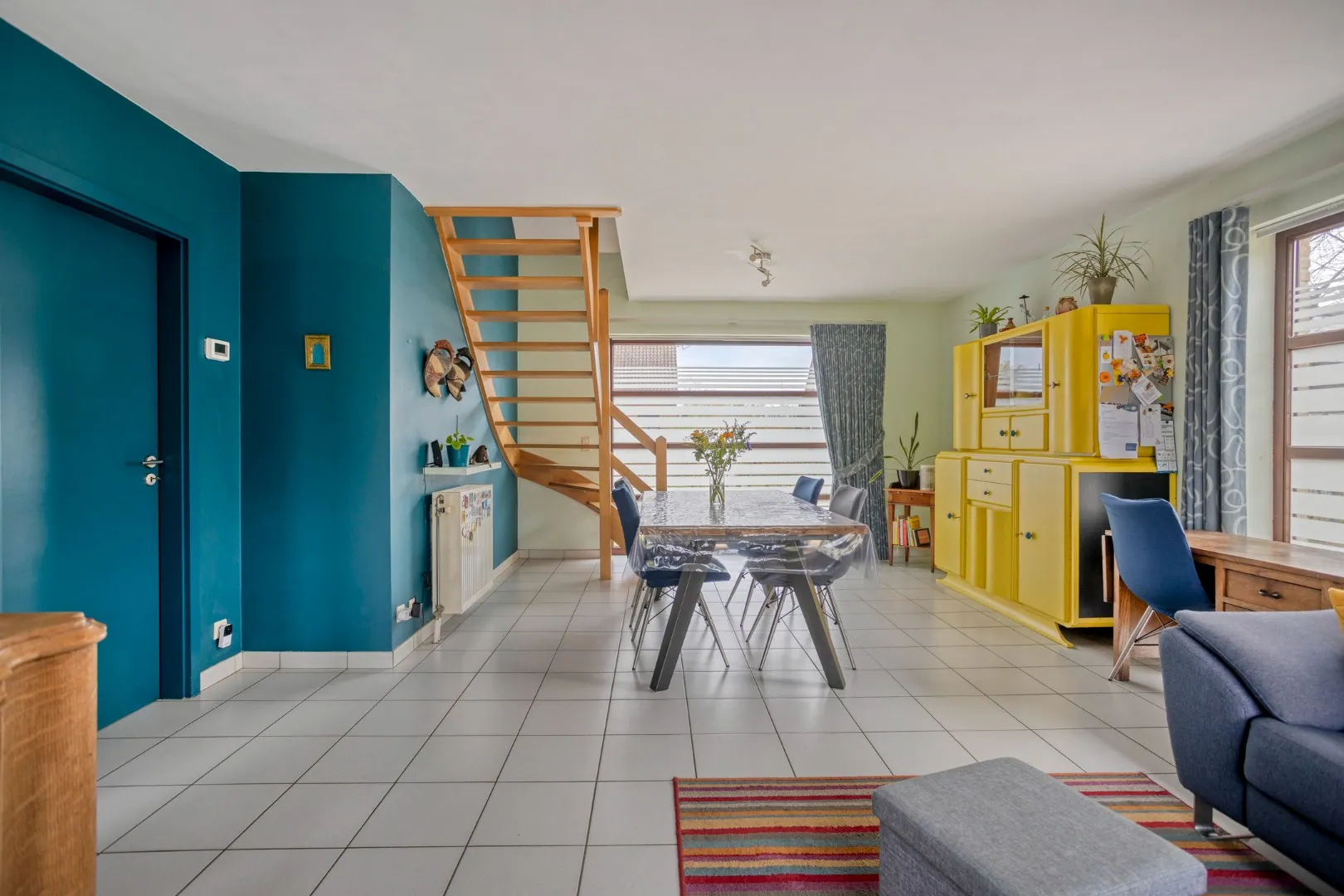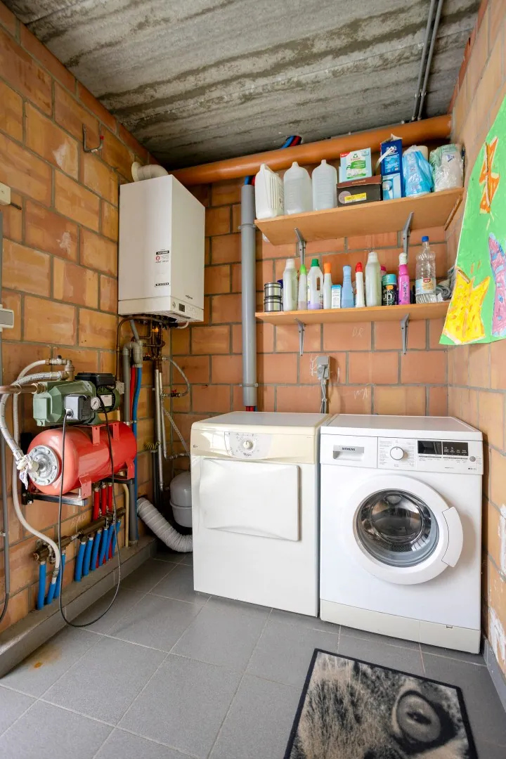 We betreden de woning via de inkomhal met vestiaire, die ons leidt naar de lichtrijke open eet- en leefruimte. Aansluitend bevindt zich de volledig uitgeruste keuken met prachtig uitzicht op de groene tuin. Op de gelijkvloerse verdieping vinden we verder nog een apart gastentoilet, een ruime berging en een praktische wasplaats/technische ruimte.