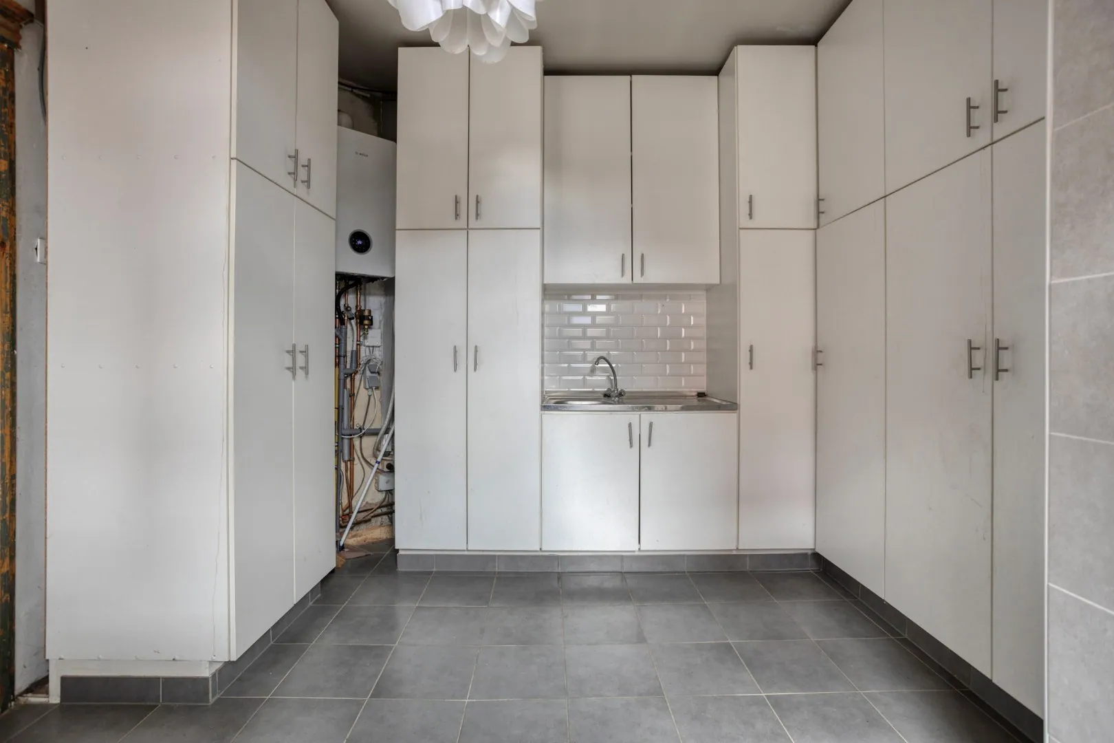 We betreden de woning via de inkomhal die toegang geeft tot de ruime leef- en eetruimte. Aanpalend bereiken we de volledig uitgeruste keuken dewelke uitzicht geeft op het overdekte terras. Achterliggend is er een ruime berging, voorzien van ingemaakte kasten en de nodige aansluitingen voor was- en droogmachine. Verder biedt het gelijkvloers ons nog een gastentoilet en een ruime en droge voorraadkelder.