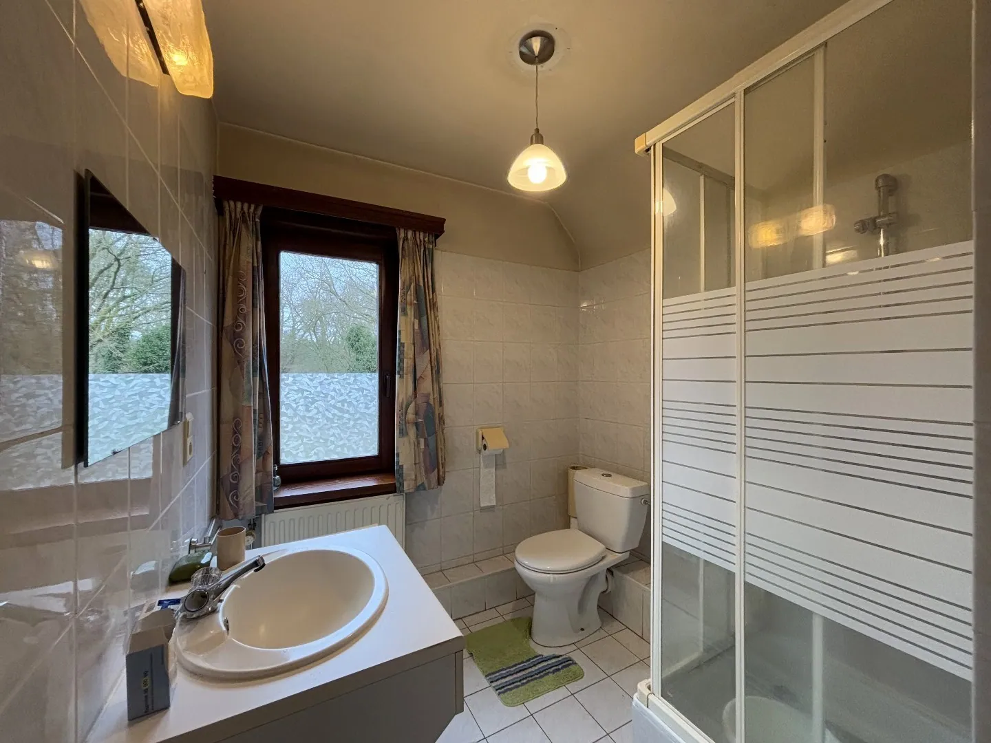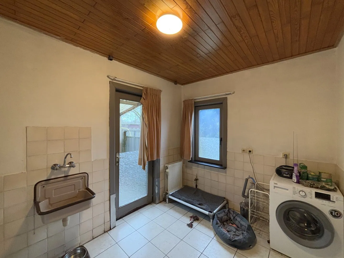 Bij binnenkomst in de woning leidt de inkomhal naar een ruime, lichtrijke woonkamer en een keuken met toegang tot een praktische kelder. Aansluitend aan de keuken vinden we een badkamer met bad en wastafel, een aparte wasruimte en een gastentoilet. Daarnaast biedt de veranda van 20 m² extra leefruimte met zicht op de tuin.