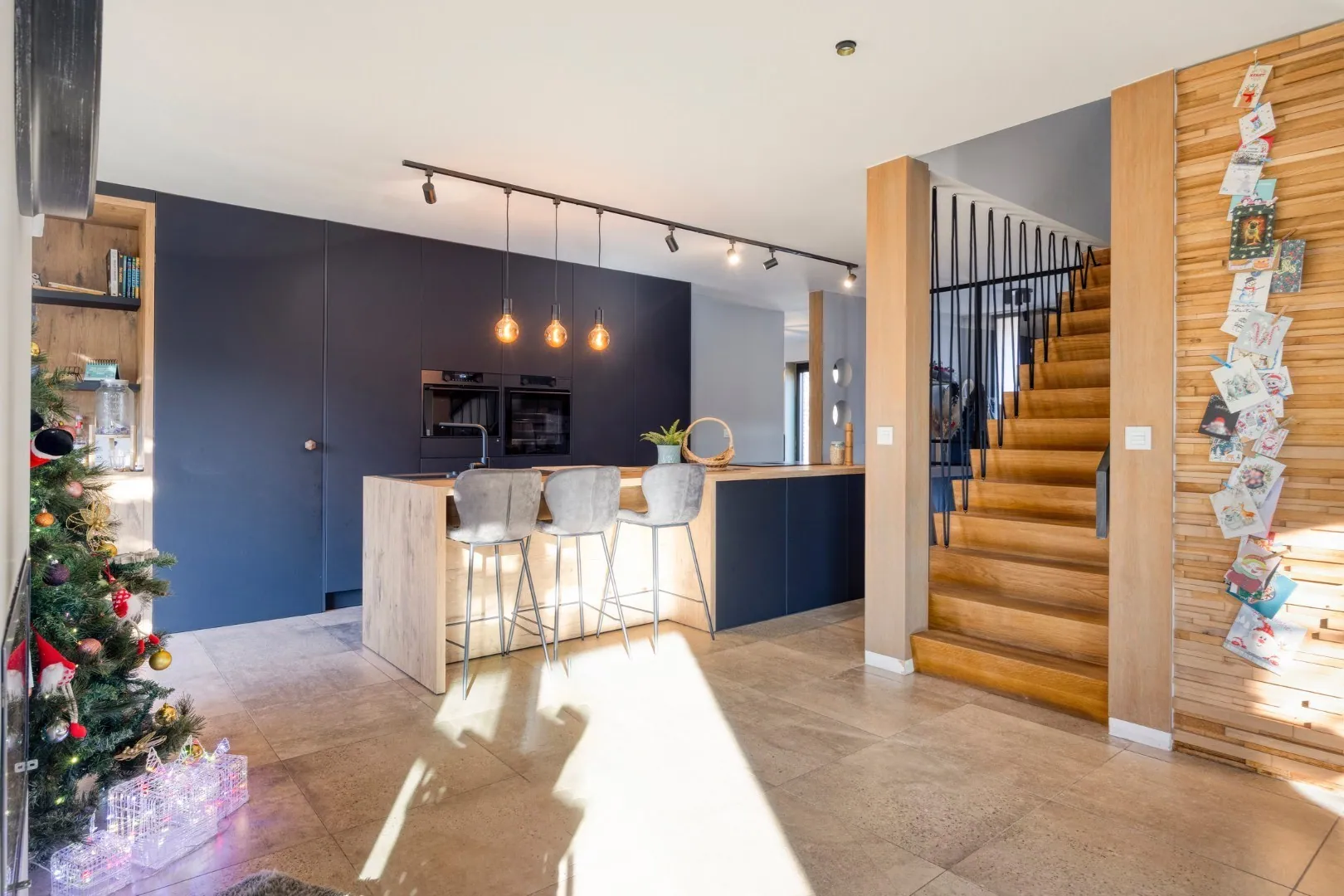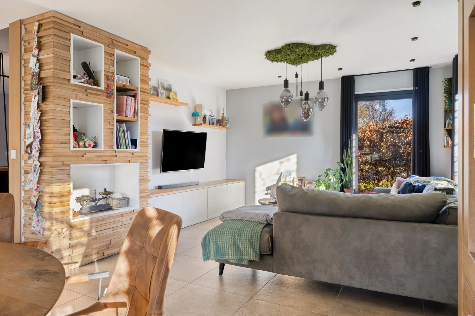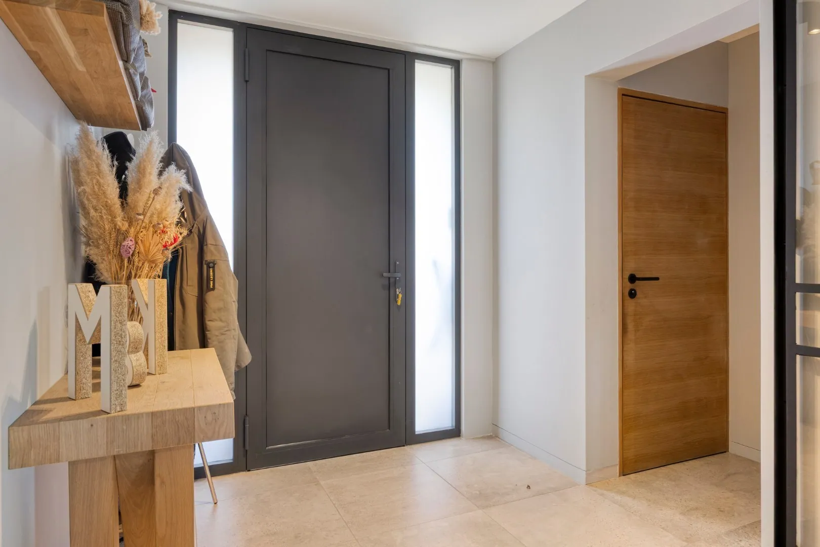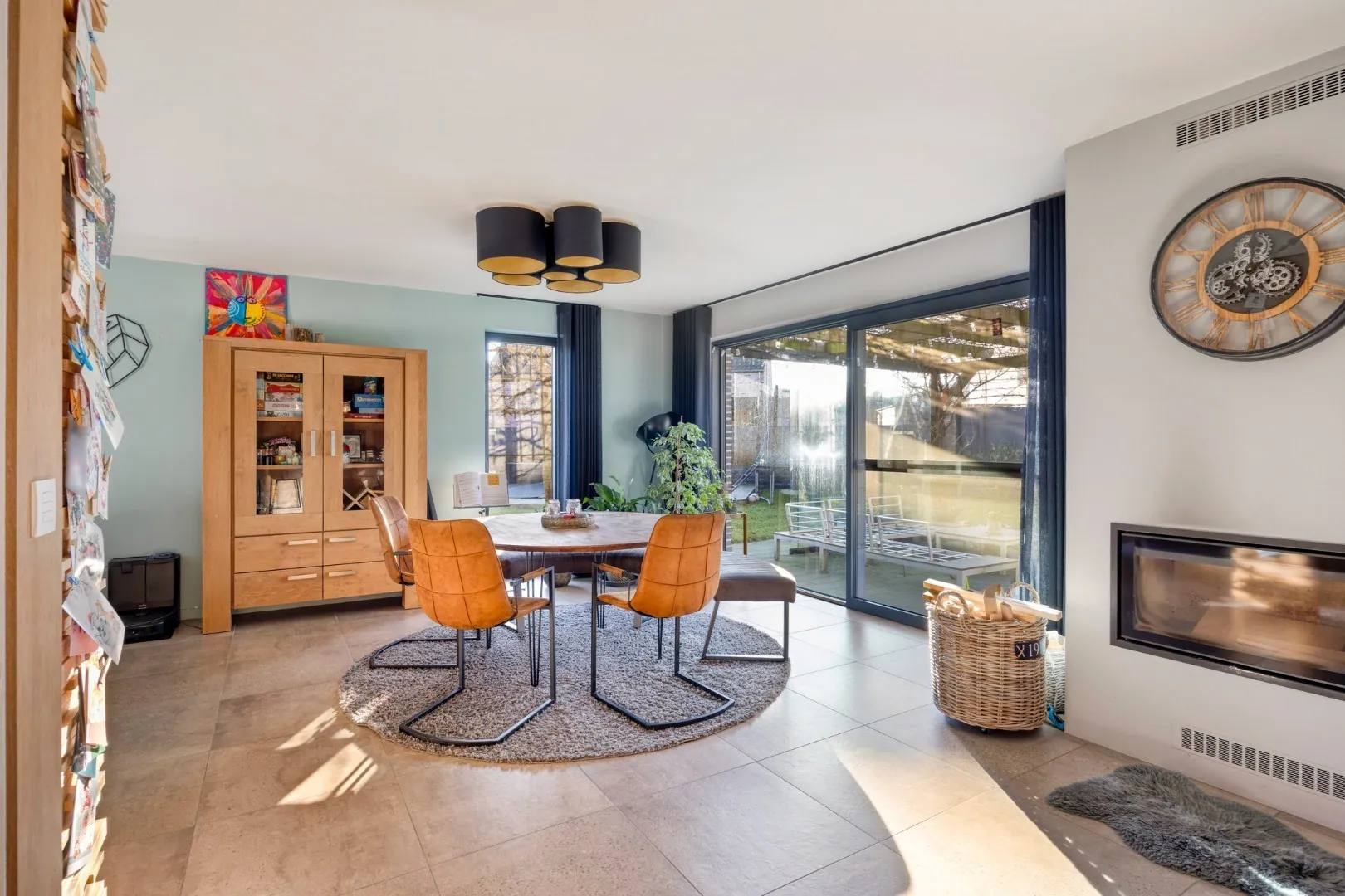 We betreden de woning via de ruime inkomhal met apart gastentoilet. Van hieruit is er toegang tot de open, volledig uitgeruste keuken, die in januari 2025 volledig werd vernieuwd. Aansluitend bevinden zich een bureauruimte en de ruime, lichtrijke leefruimte met gezellige inbouwhaard.