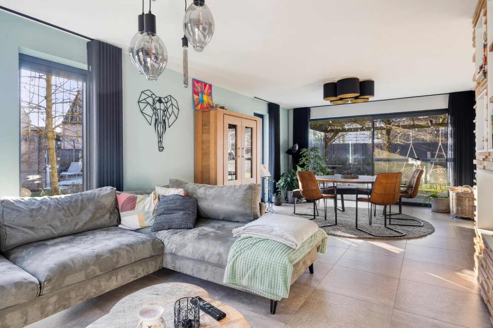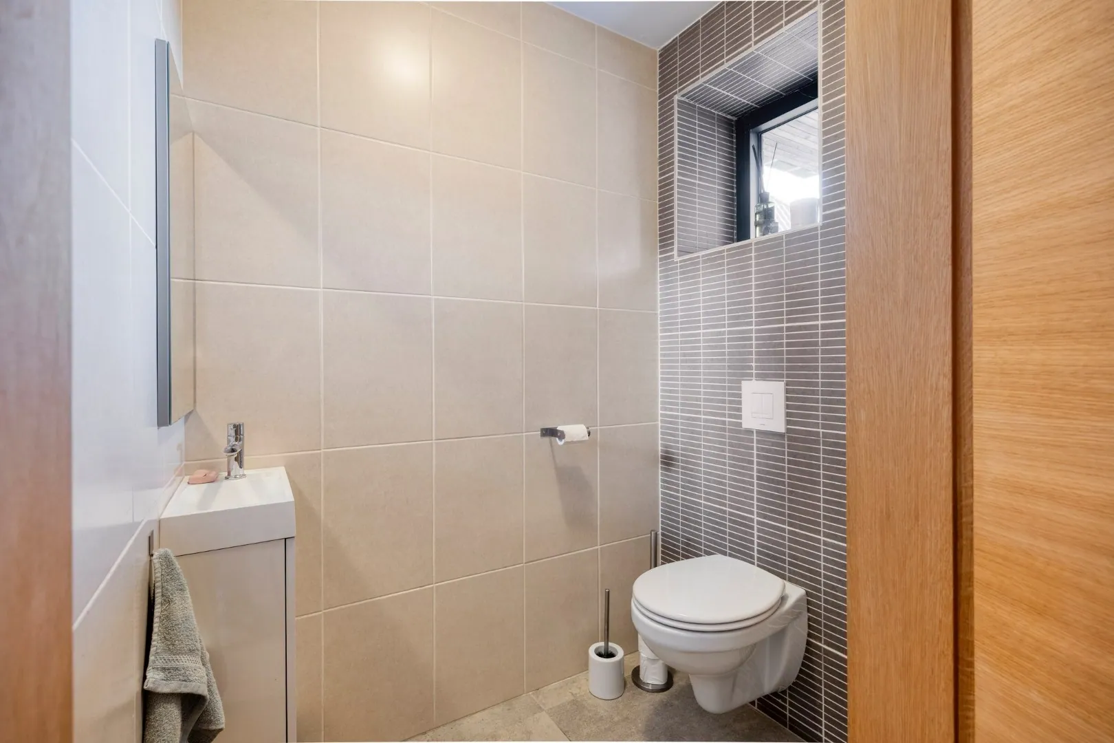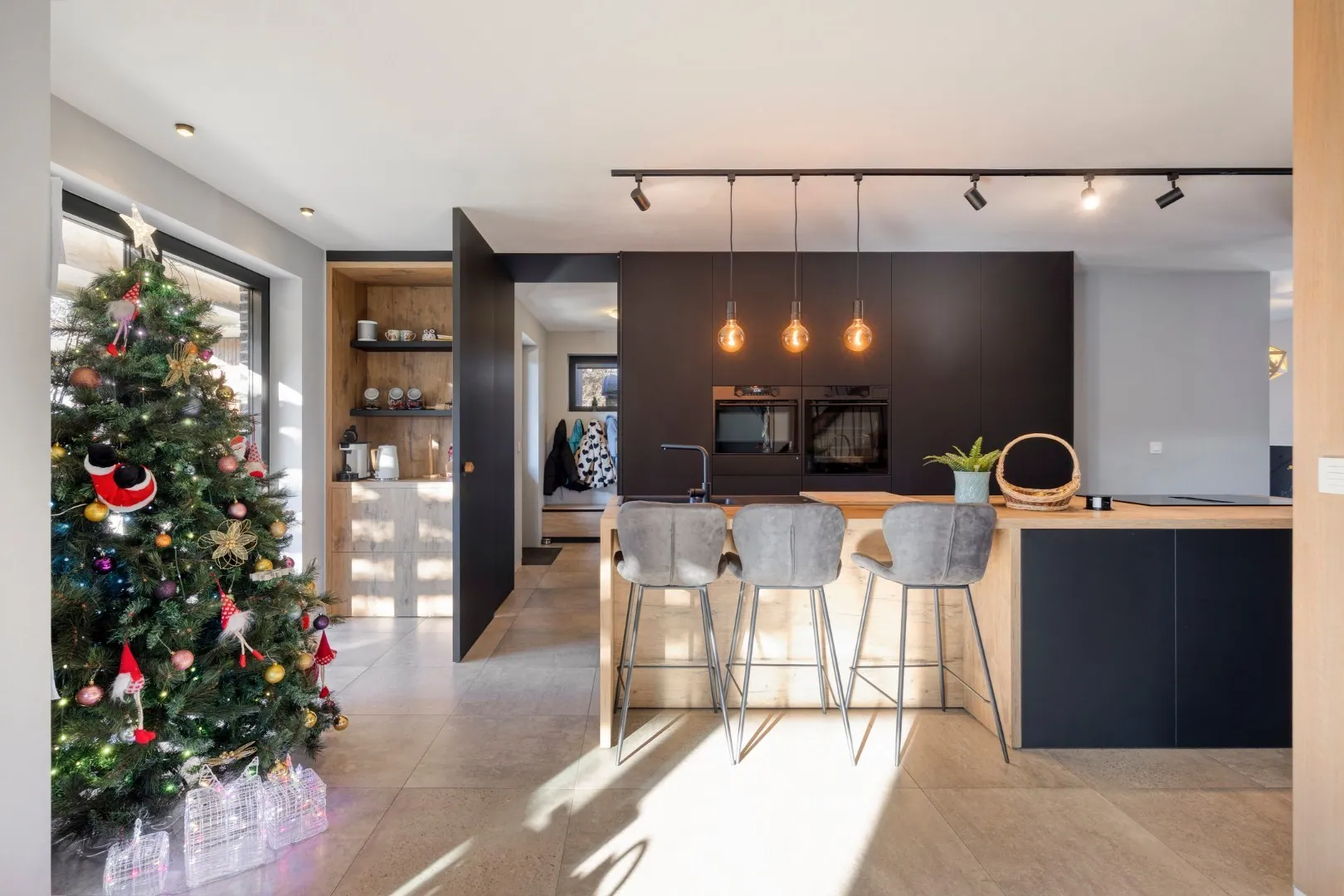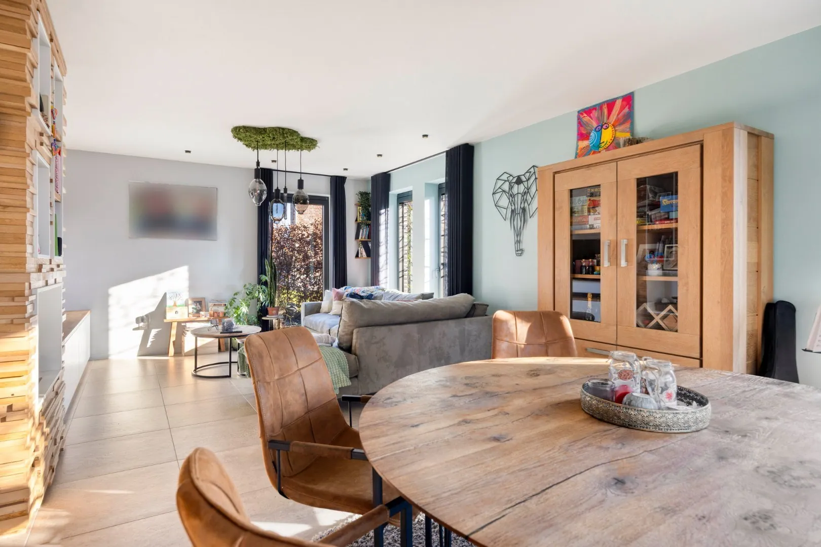 We betreden de woning via de ruime inkomhal met apart gastentoilet. Van hieruit is er toegang tot de open, volledig uitgeruste keuken, die in januari 2025 volledig werd vernieuwd. Aansluitend bevinden zich een bureauruimte en de ruime, lichtrijke leefruimte met gezellige inbouwhaard.