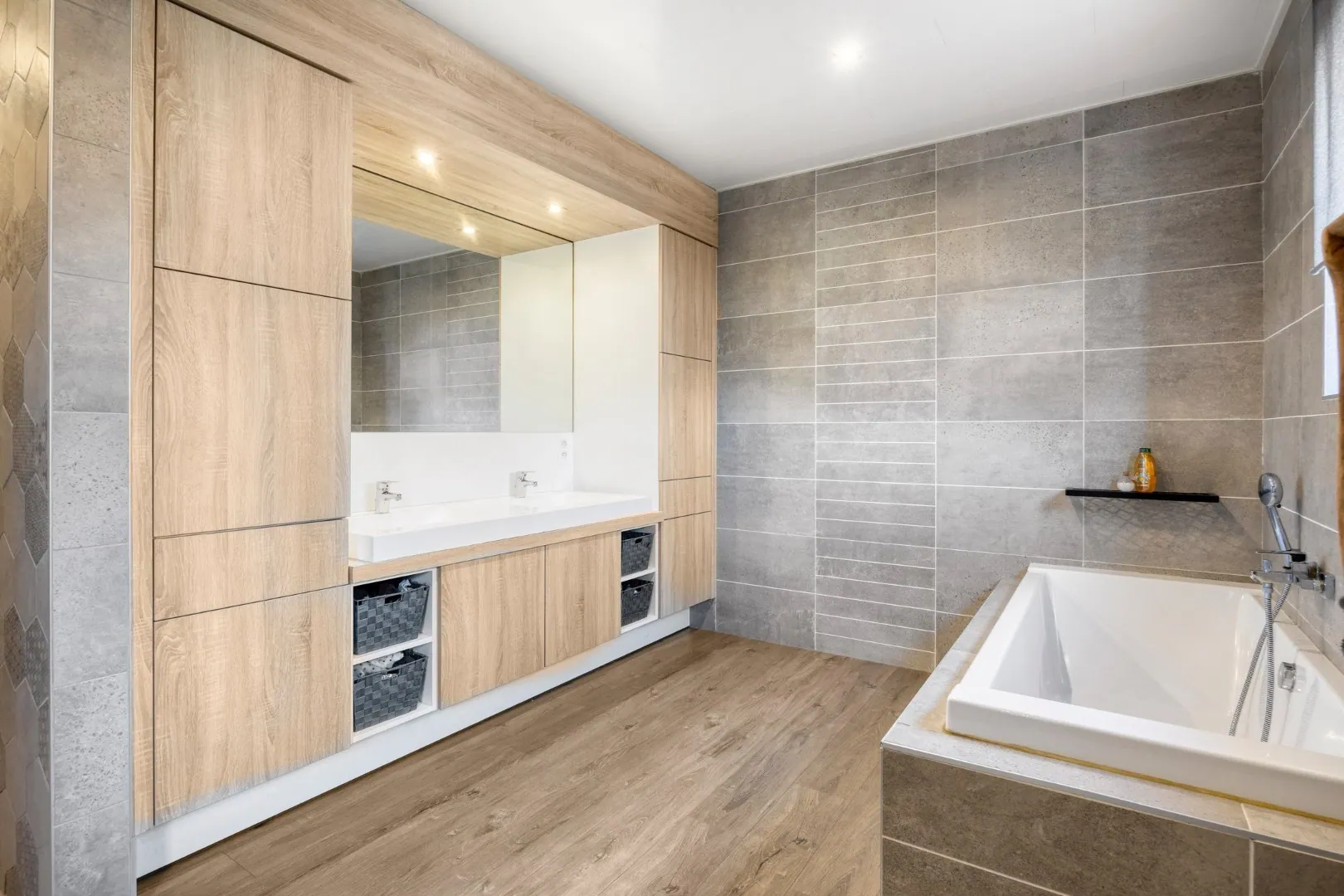 Via de vaste trap in de woonkamer bereiken we de eerste verdieping. Hier bevinden zich een handige berging/technische ruimte en vier slaapkamers, waarvan de master bedroom beschikt over een inloopdressing. De zeer ruime badkamer is uitgerust met een ligbad, een dubbele lavabo met opbergmogelijkheden en een inloopdouche.
