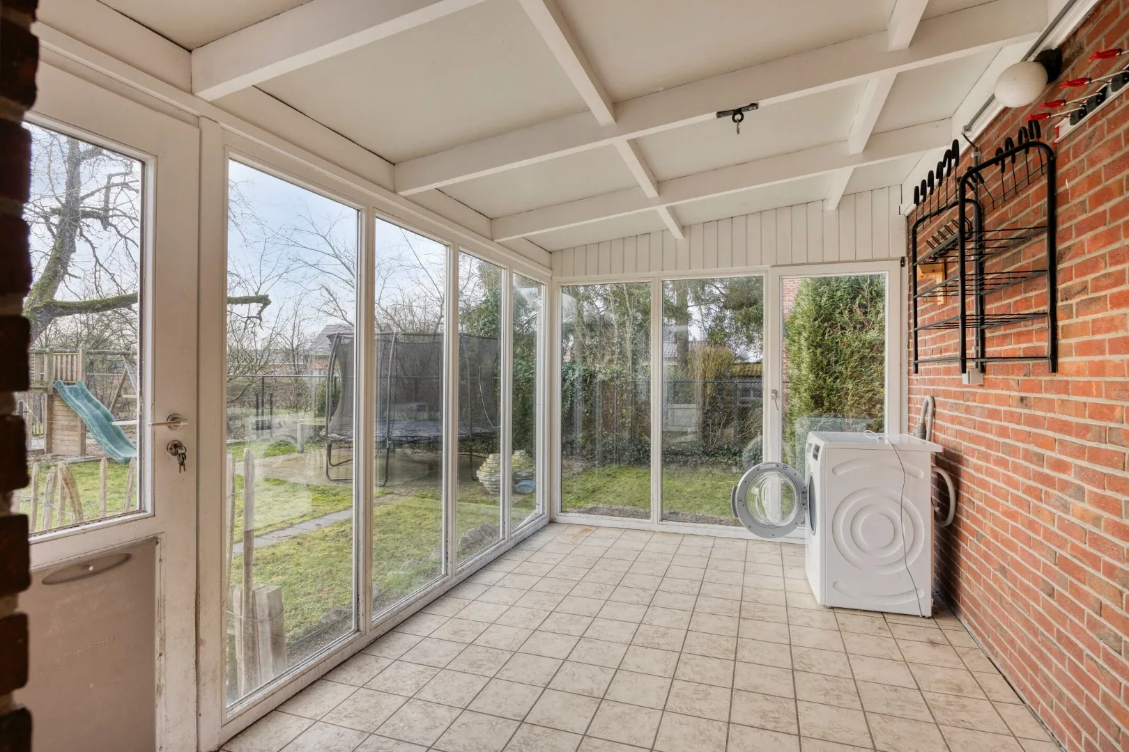 We betreden de woning via de ruime inkomhal, die directe toegang biedt tot de lichtrijke woonkamer. Achteraan de woning bevinden zich een badkamer met inloopdouche, inbouwkasten, wastafel, aansluiting voor wasmachine en twee toiletten. Verder is er een veranda met voorzieningen voor wasmachine en een ruime keuken met een tweede veranda, waar het heerlijk vertoeven is met een prachtig uitzicht op de tuin.