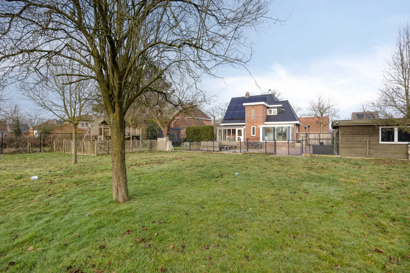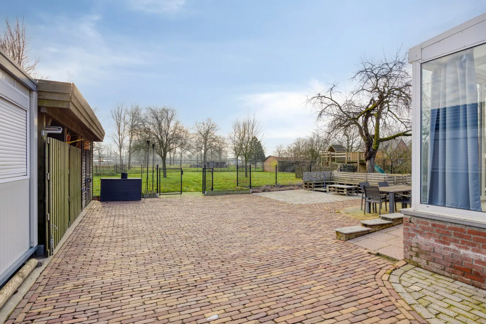 Buiten kan men volop genieten van het buitenleven en het mooie, open uitzicht. Er is een ruim terras, een speelgedeelte voor kinderen en de tuin beschikt over twee aparte units die voor meerdere doeleinden kunnen worden gebruikt (bijberoep, hobbyruimte of extra opslag).