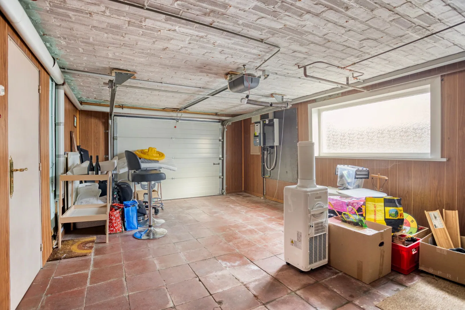 De inpandige garage biedt vervolgens de toegang naar een wasplaats, dewelke is uitgerust met alle voorzieningen voor een wasmachine en een droogkast, een technische ruimte én een ruime voorraadkelder.