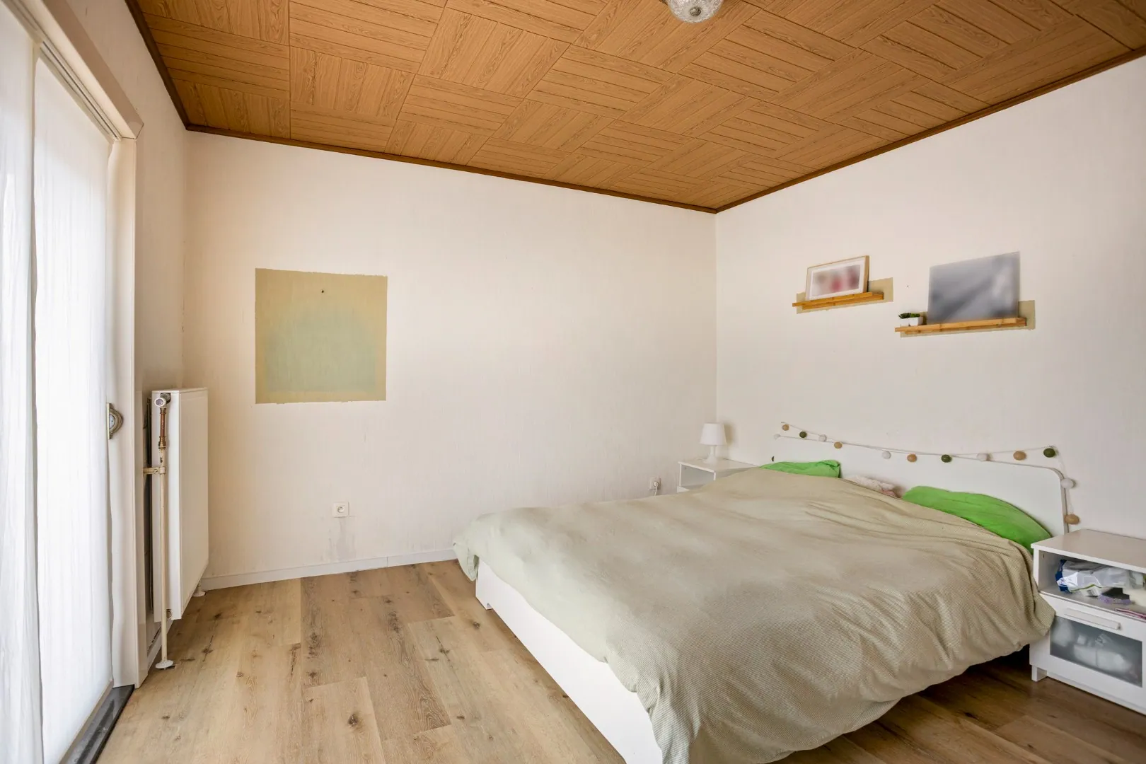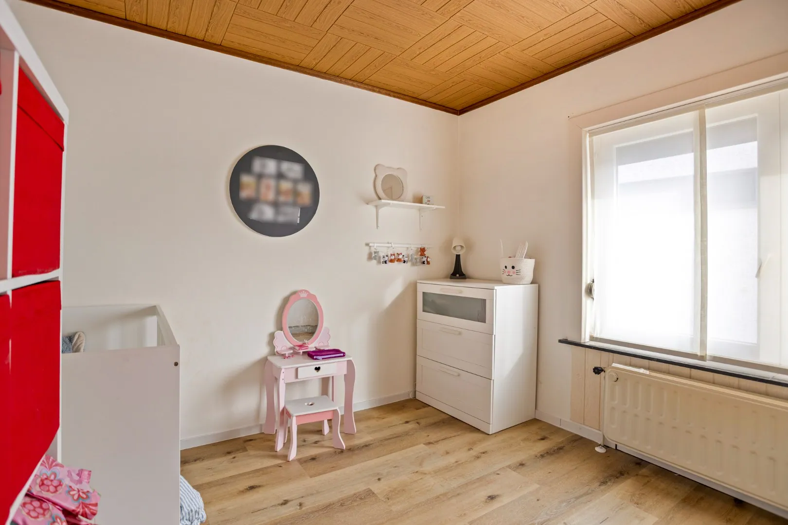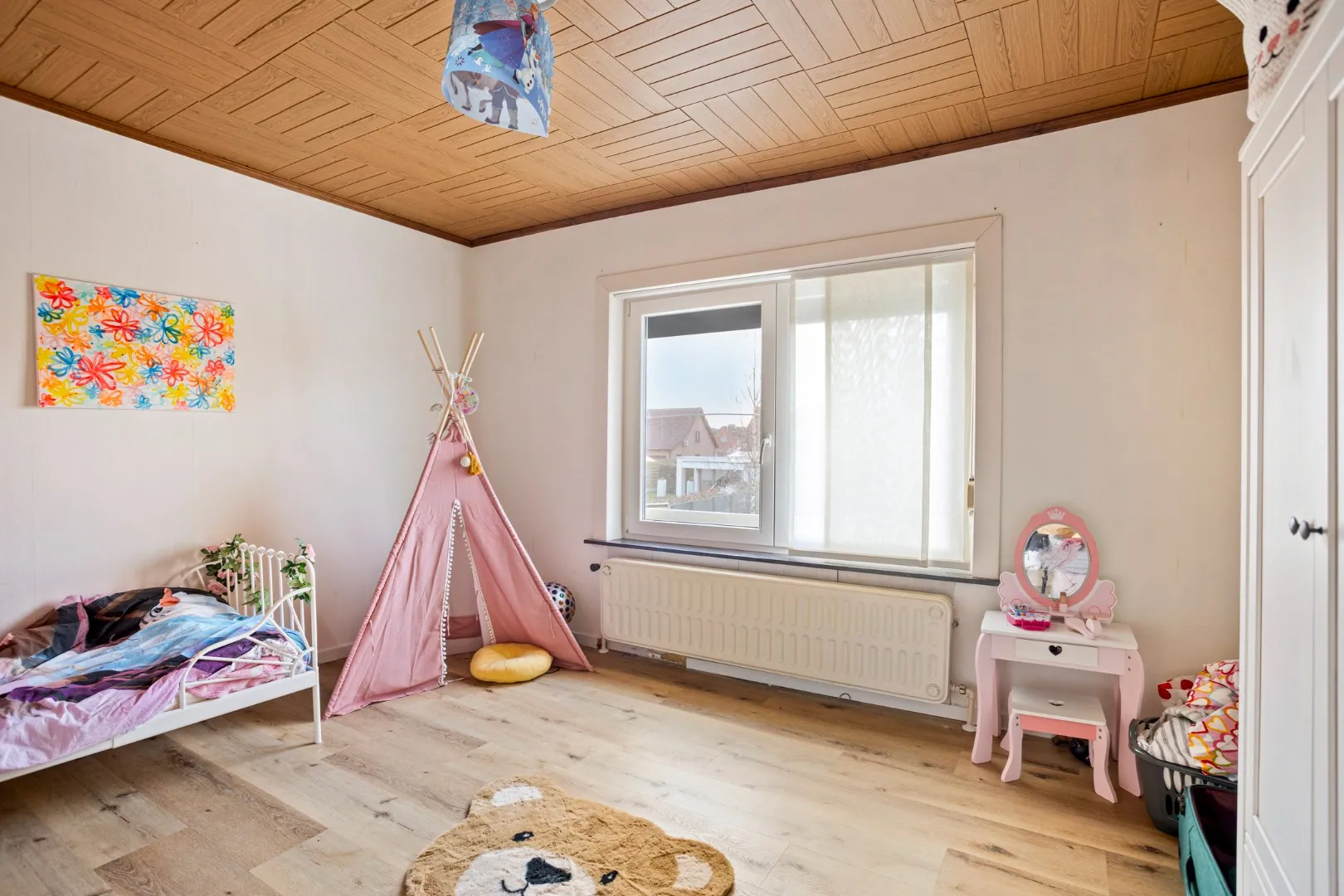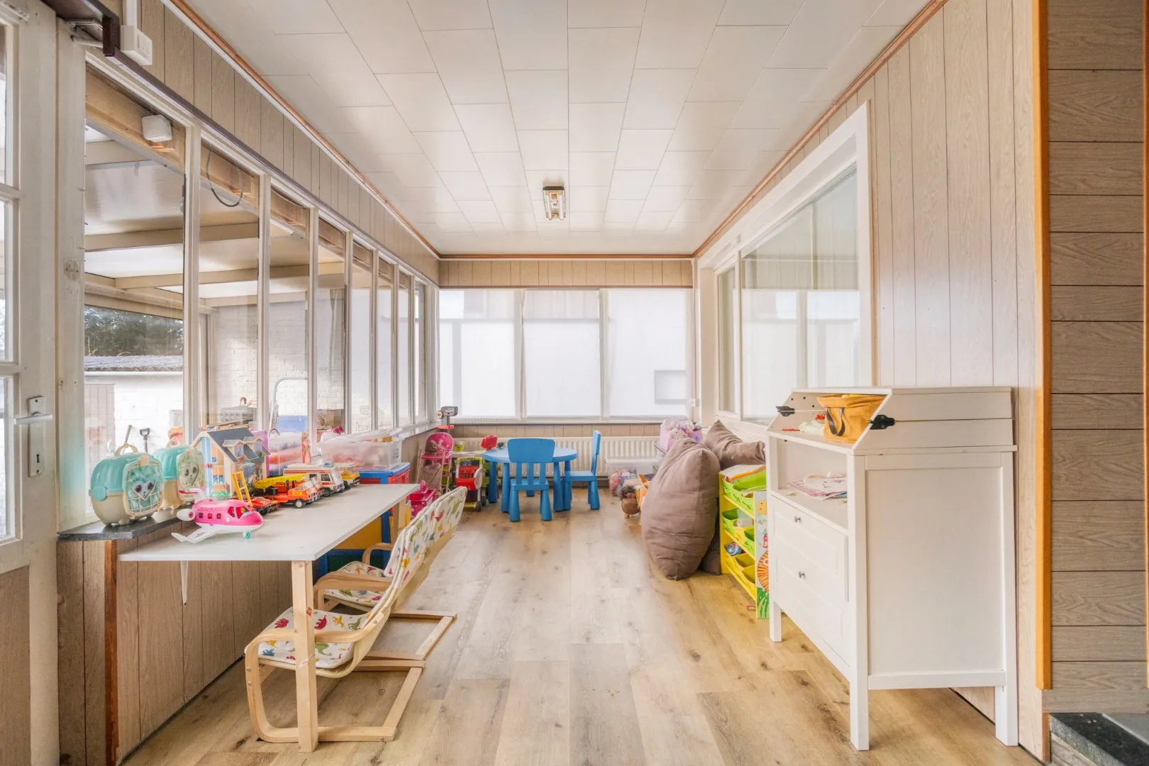 Bij het betreden van de woning komt u via de inkomhal terecht in een ruime en lichtrijke leef- en eetruimte met aanpalend de goed uitgeruste keuken. Vanuit de keuken bereiken we een speel- en bureauruimte alsook een veranda met zicht op de ruime tuin.