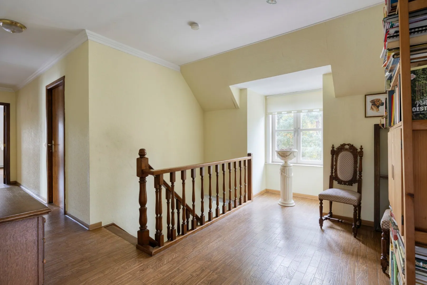 Op de eerste verdieping zijn er vier ruime slaapkamers, een badkamer met ligbad, dubbele lavabo en toilet, en een zolderruimte die kan dienen als extra slaapkamer, hobbyruimte of berging.