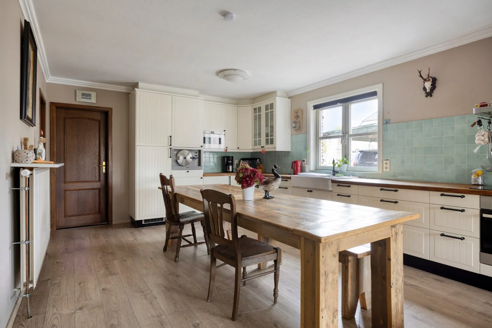 We betreden de woning via een ruime inkomhal, die toegang biedt tot een apart gastentoilet, een bureauruimte en de lichtrijke woonkamer met een gezellige houtkachel. Aansluitend bevindt zich een recente, volledig ingerichte keuken.