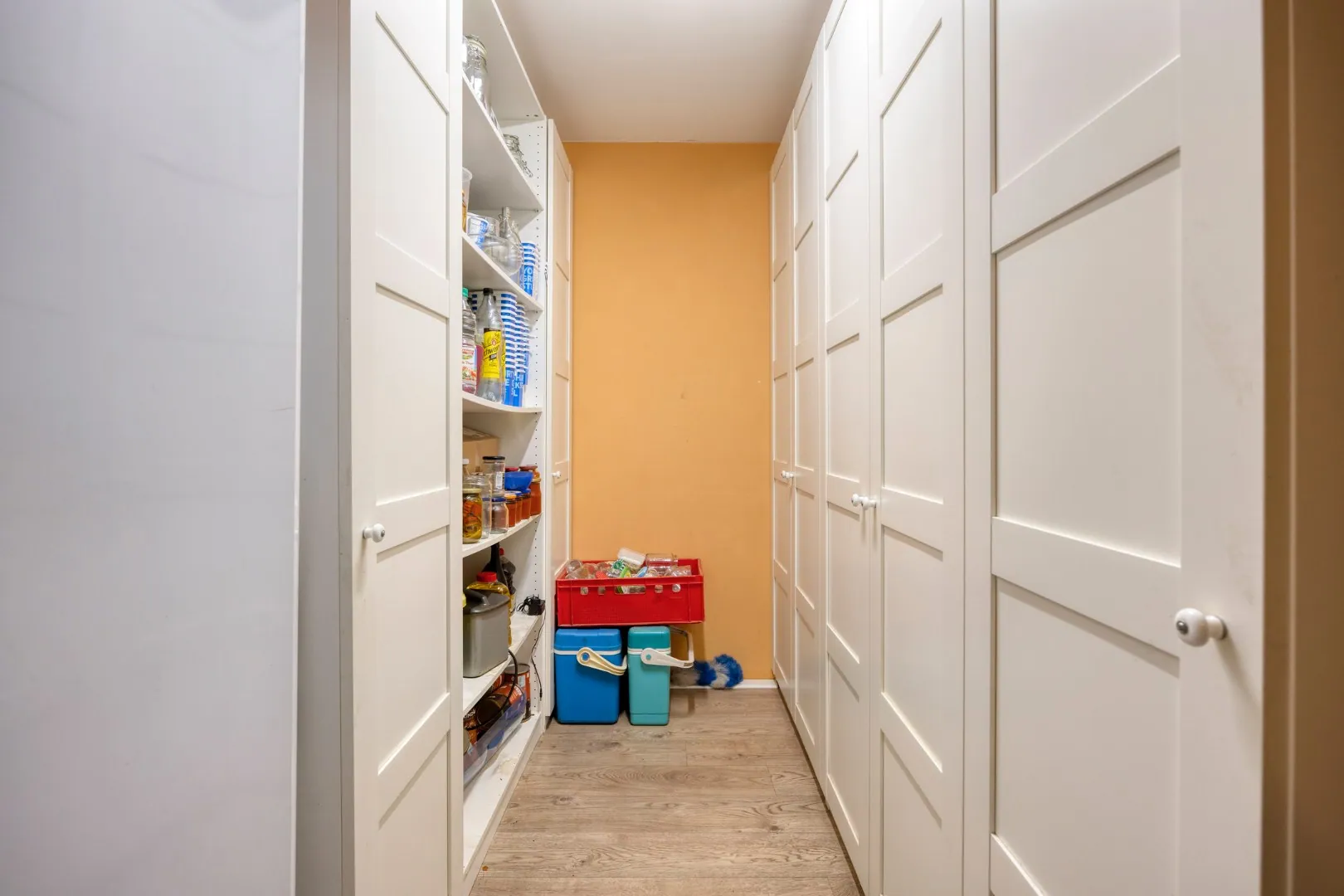 Verder vind je op het gelijkvloers een berging/wasplaats, een dubbele garage (momenteel ingericht als hondentrimsalon) en een badkamer met douche, toilet en aansluitingen voor wasmachine en droogkast.