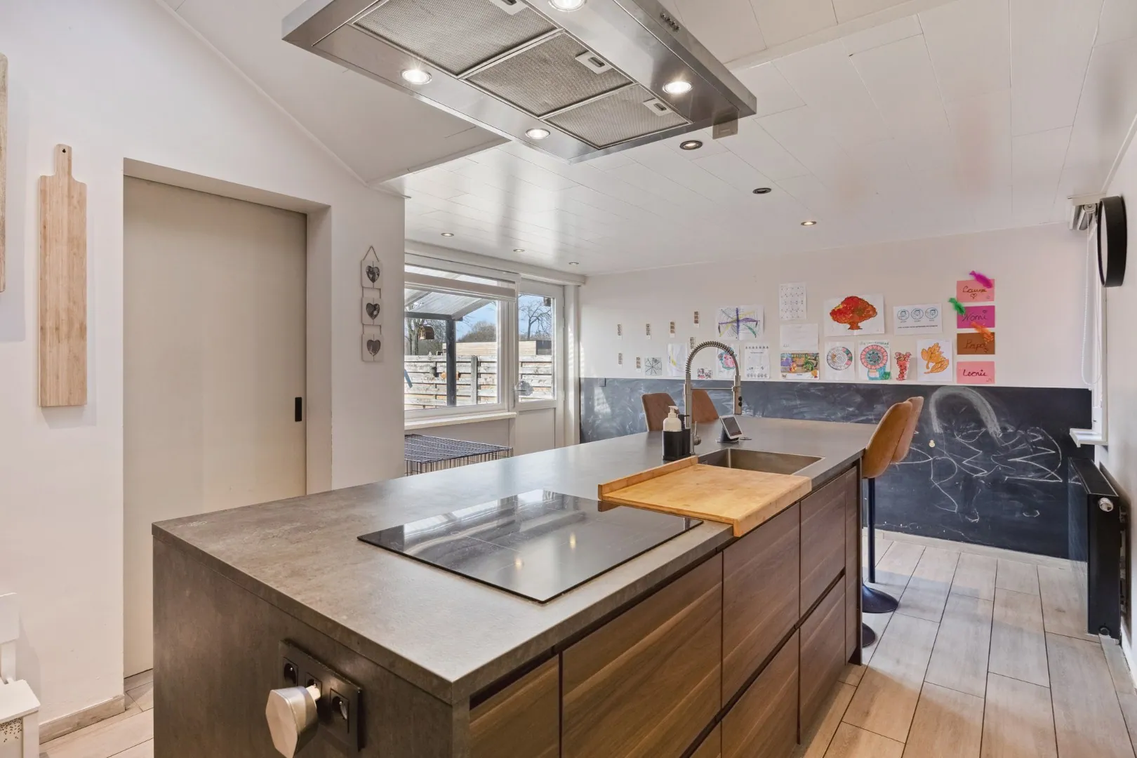 We betreden de woning via de inkomhal. Deze geeft directe toegang tot de ruime, lichtrijke woonkamer met gezellige houtkachel. Aansluitend vinden we de vernieuwde, volledig uitgeruste keuken. Achteraan bevinden zich nog een berging/wasplaats met ingemaakte kasten, apart toilet en een ruime badkamer.