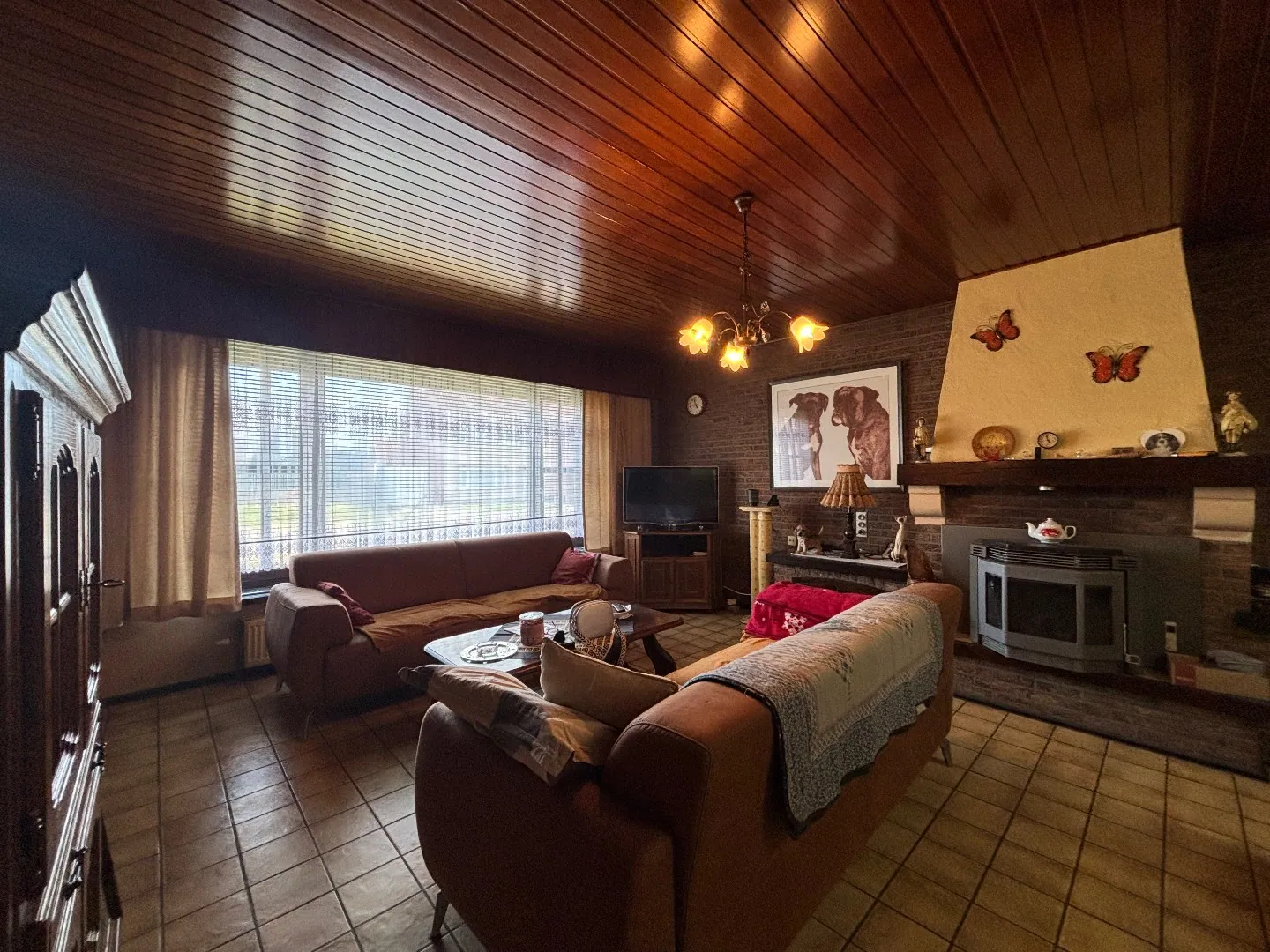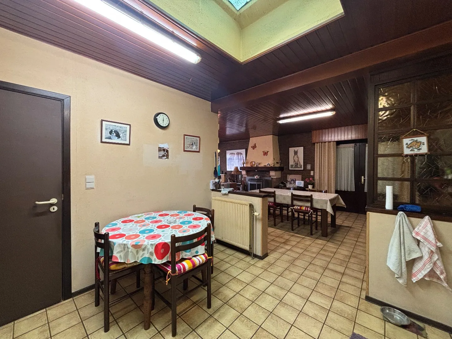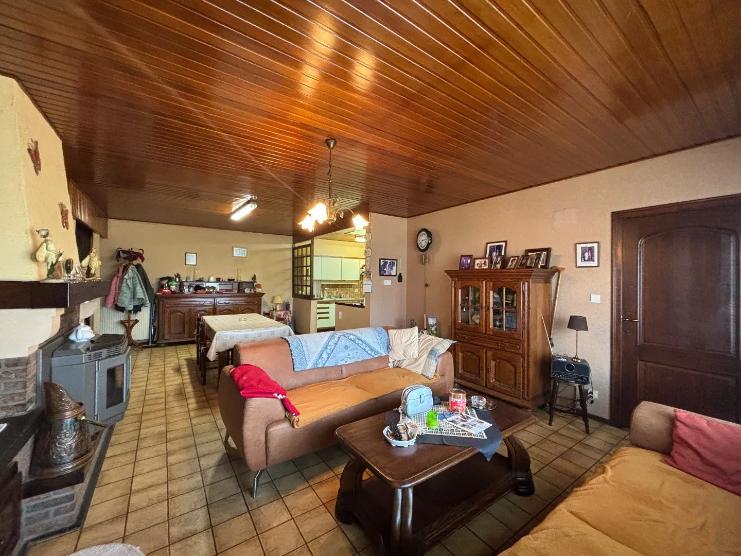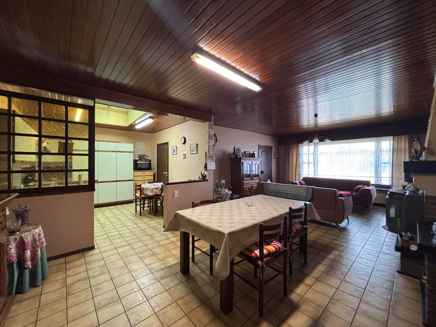 We betreden de woning via de ruime inkomhal, die toegang biedt tot de garage, de kelder en de gezellige woonkamer. Deze is voorzien van een sfeervolle pelletkachel. Aansluitend bevindt zich de praktische open keuken met voldoende opberg- en werkruimte.