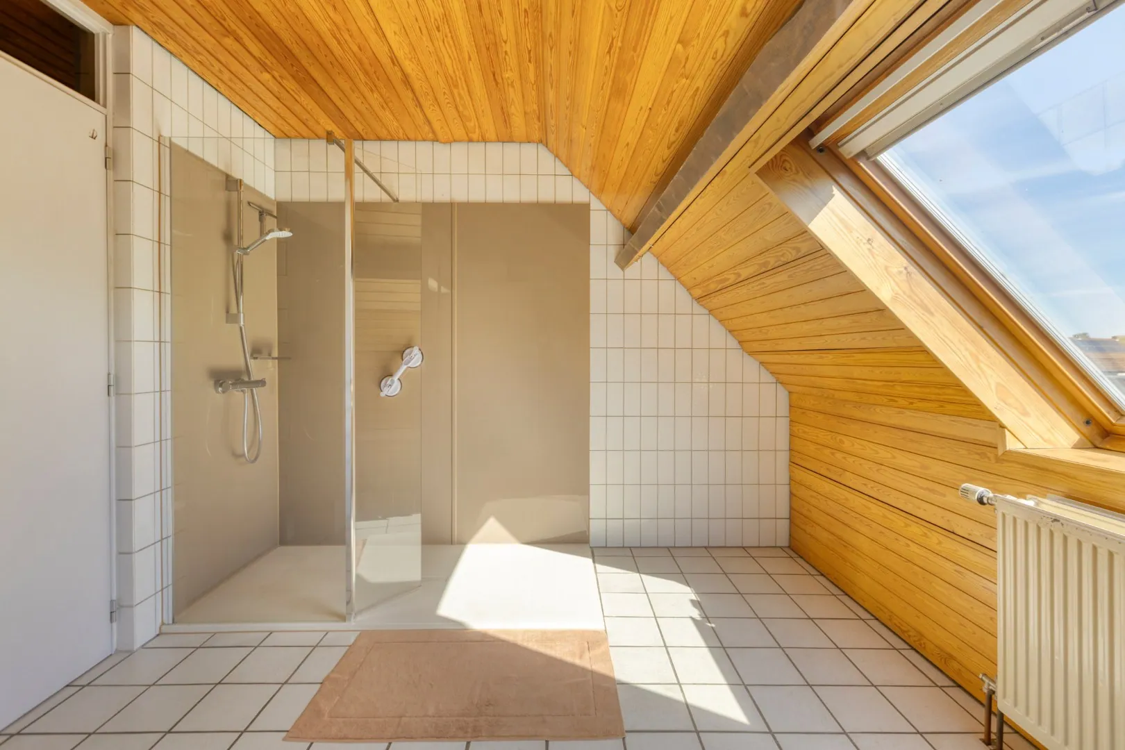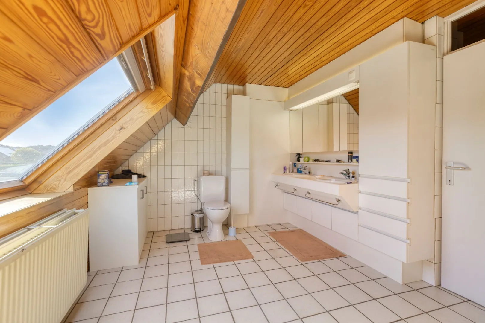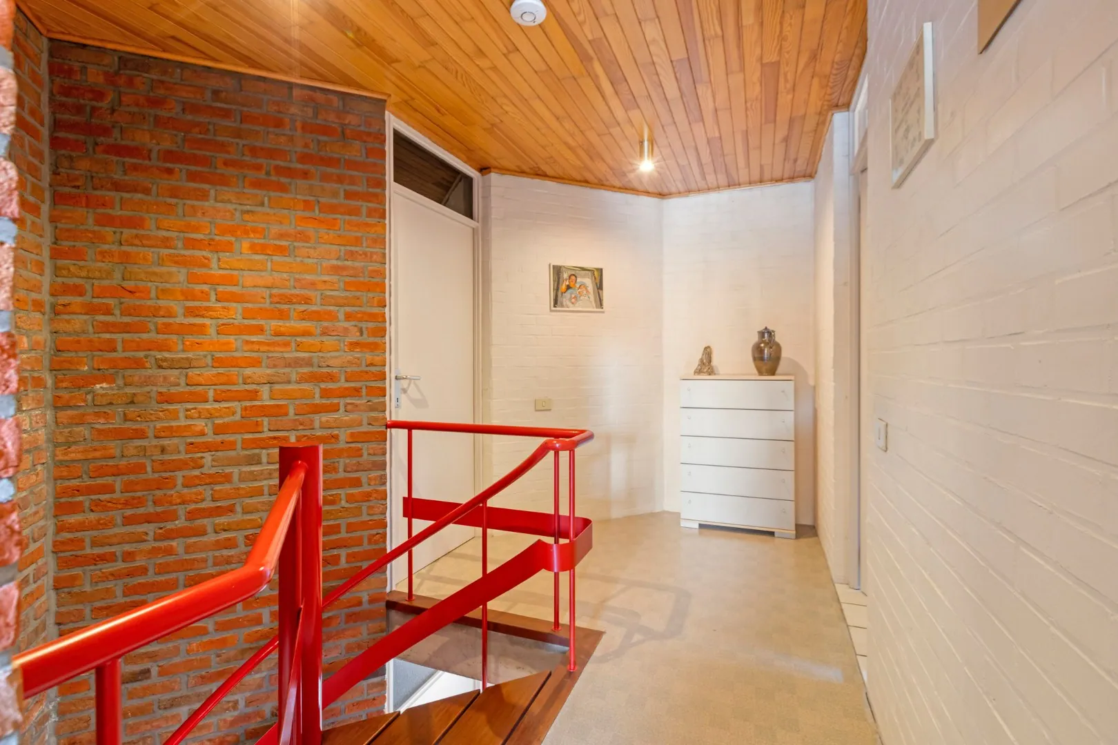 De eerste verdieping bereiken we via de vaste trap in de inkomhal. Hier bevinden zich drie ruime slaapkamers en een badkamer met dubbele wastafel, toilet en recente inloopdouche.