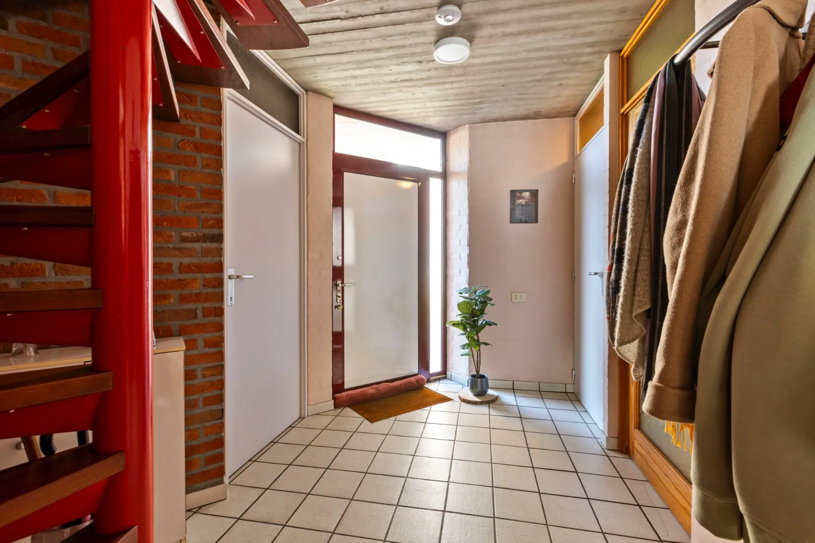 We betreden de woning in de inkomhal met gastentoilet. Deze geeft toegang tot de garage met voorzieningen voor wasmachine, de volledig uitgeruste keuken en de ruime woonkamer met aansluitend een bureauruimte.