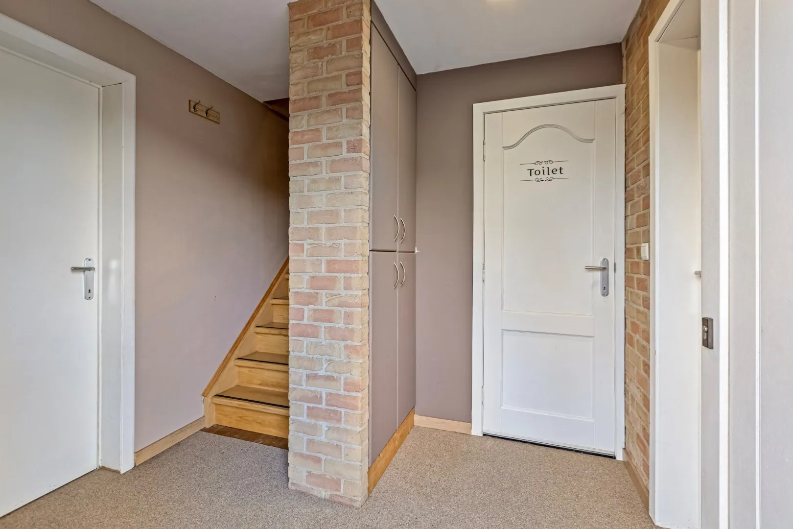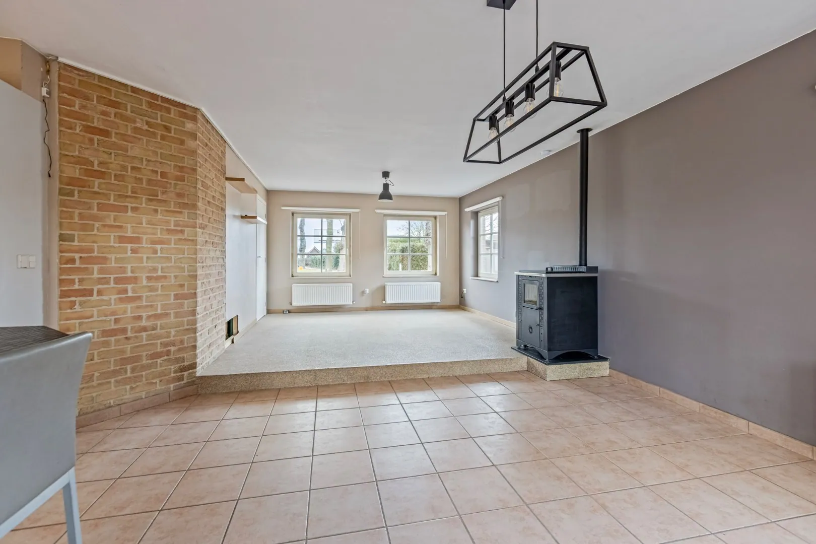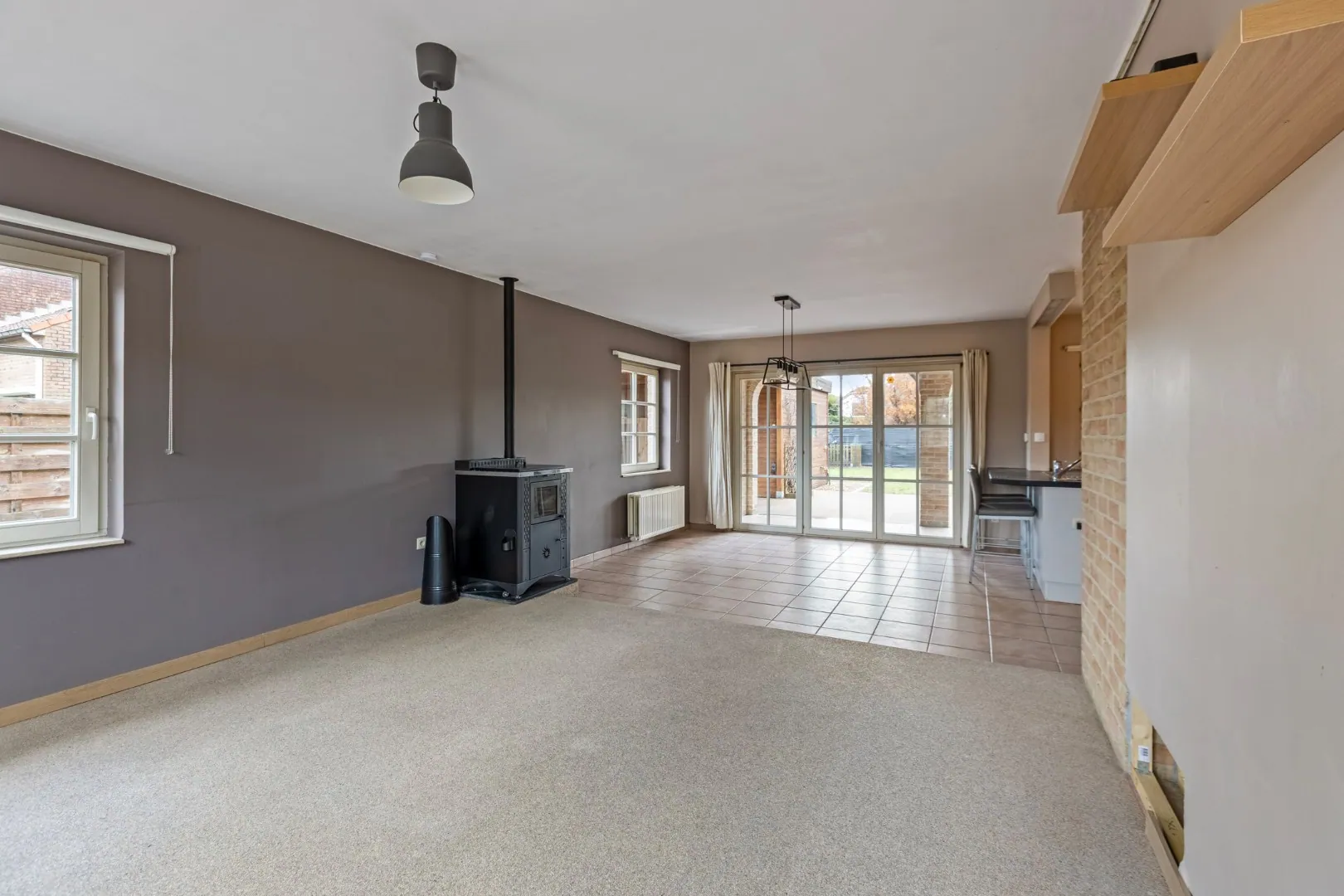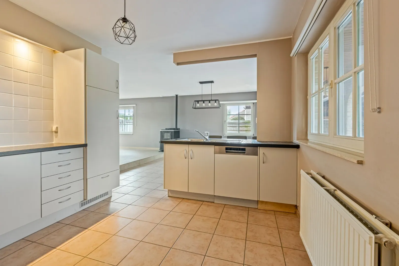 We betreden de woning via de ruime inkomhal met apart gastentoilet. Vanuit de inkomhal is er toegang tot de gelijkvloerse, ruime slaapkamer en de lichtrijke woonkamer met gezellige houtkachel. Aansluitend bevindt zich de uitgeruste open keuken.