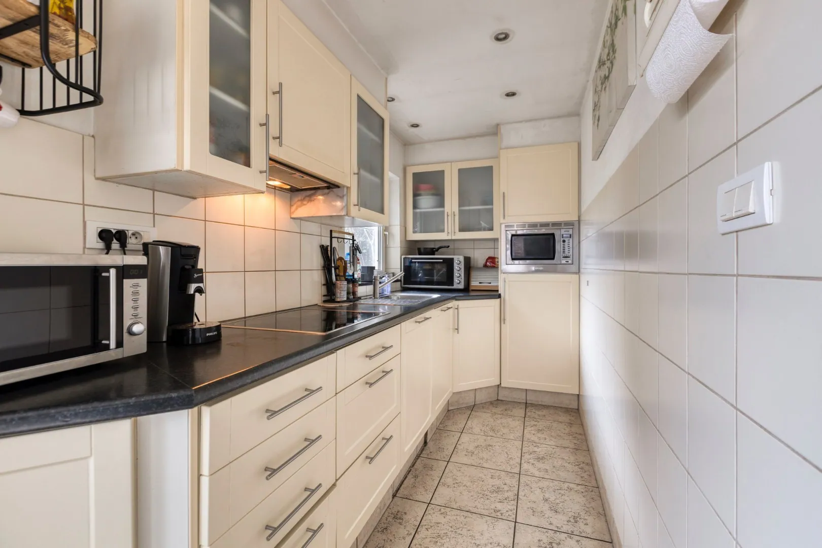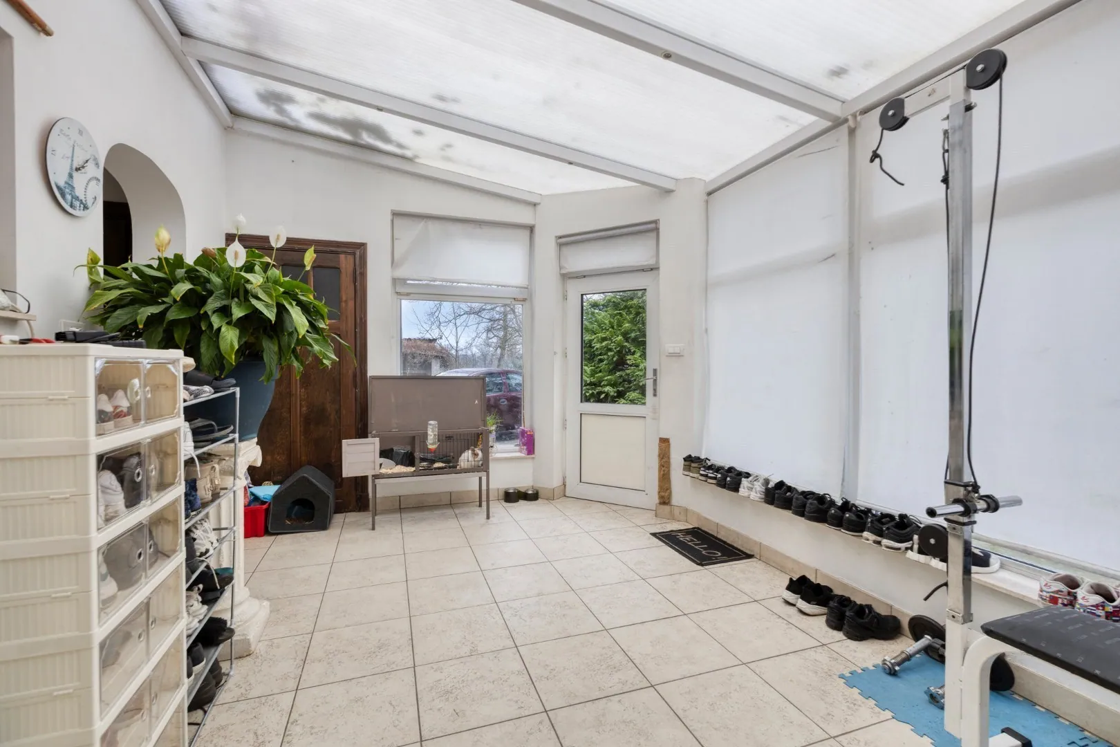 We betreden de woning via de ruime inkomhal, die meteen toegang biedt tot de uitgeruste keuken. Daarnaast bevindt zich de ruime, lichtrijke woonkamer met gezellige schouw. Achteraan beschikt de woning over een veranda, berging, technische ruimte, een apart toilet met urinoir en een badkamer met ligbad, dubbele lavabo en douche.