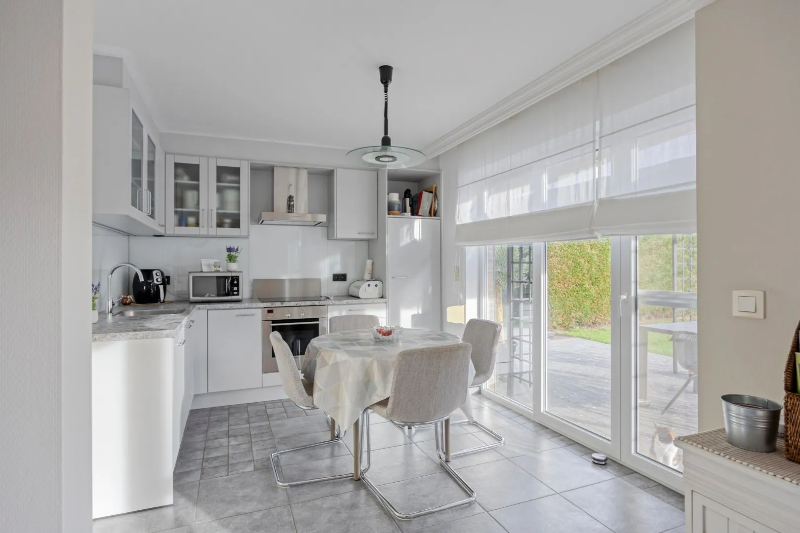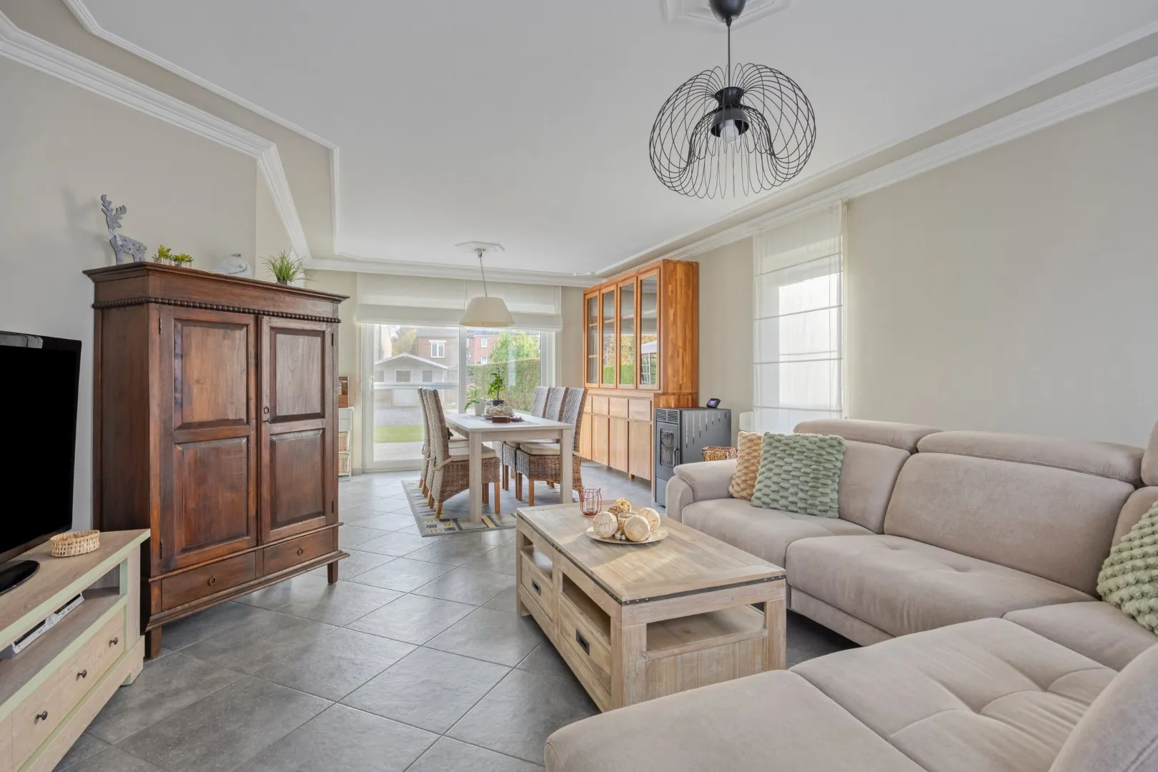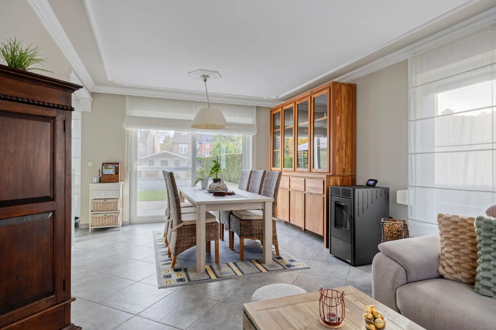 We betreden de woning via de ruime inkomhal met apart gastentoilet. De inkomhal geeft meteen toegang tot de ruime, lichtrijke woonkamer met gezellige pelletkachel. Aansluitend vinden we de volledig uitgeruste keuken. Grenzend aan de keuken bevindt zich een handige berging, van waaruit de praktische garage/wasplaats bereikbaar is.