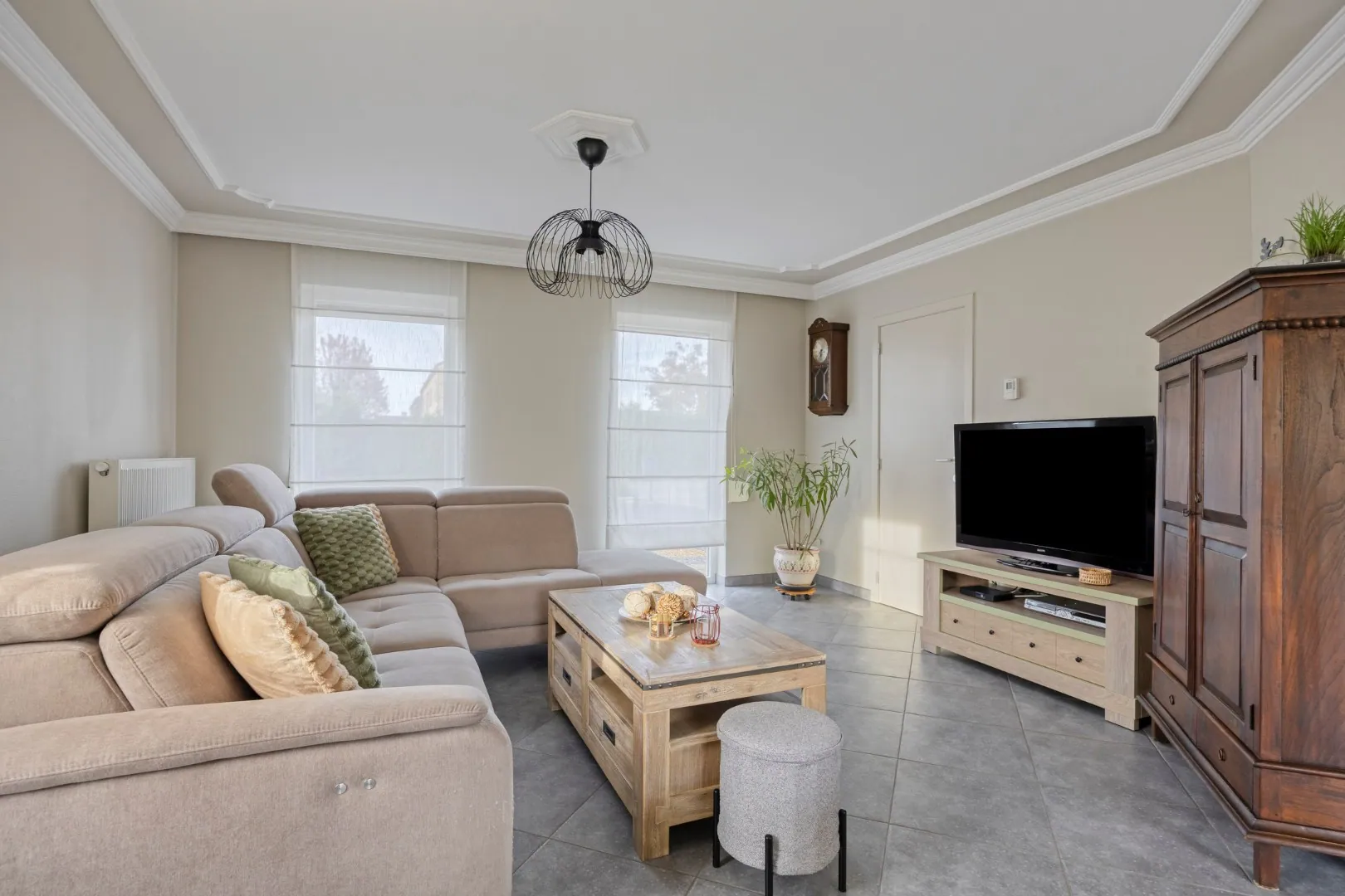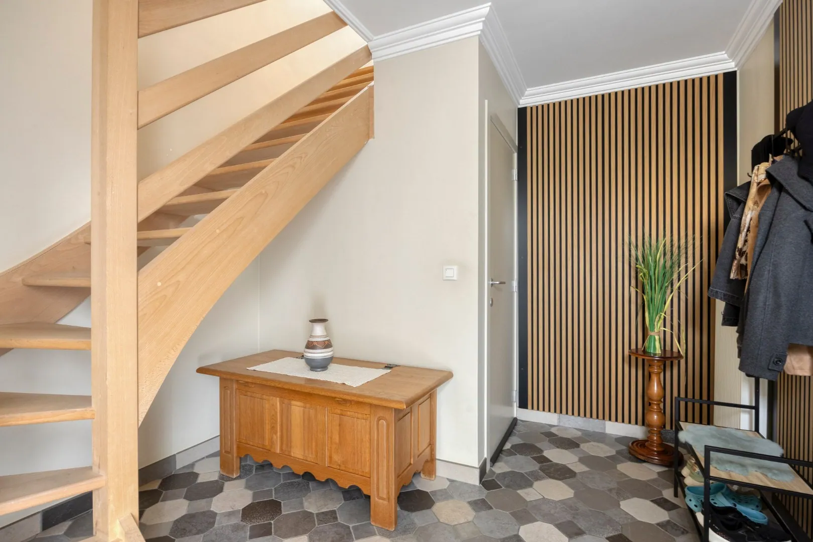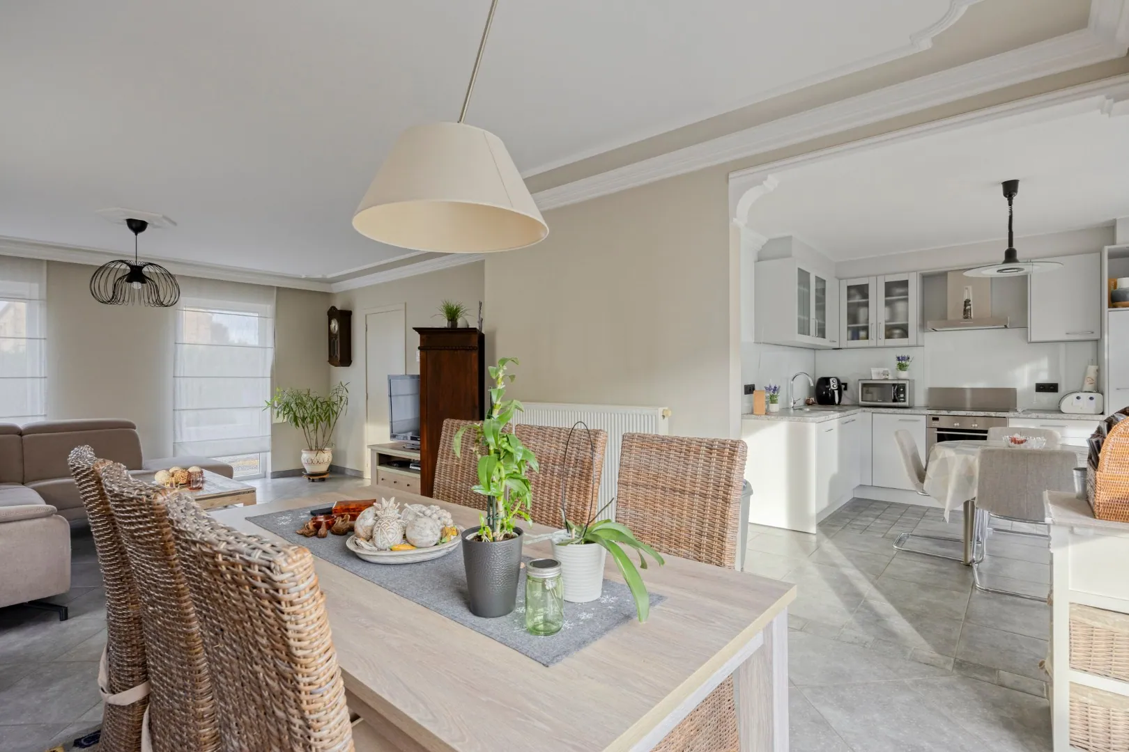 We betreden de woning via de ruime inkomhal met apart gastentoilet. De inkomhal geeft meteen toegang tot de ruime, lichtrijke woonkamer met gezellige pelletkachel. Aansluitend vinden we de volledig uitgeruste keuken. Grenzend aan de keuken bevindt zich een handige berging, van waaruit de praktische garage/wasplaats bereikbaar is.