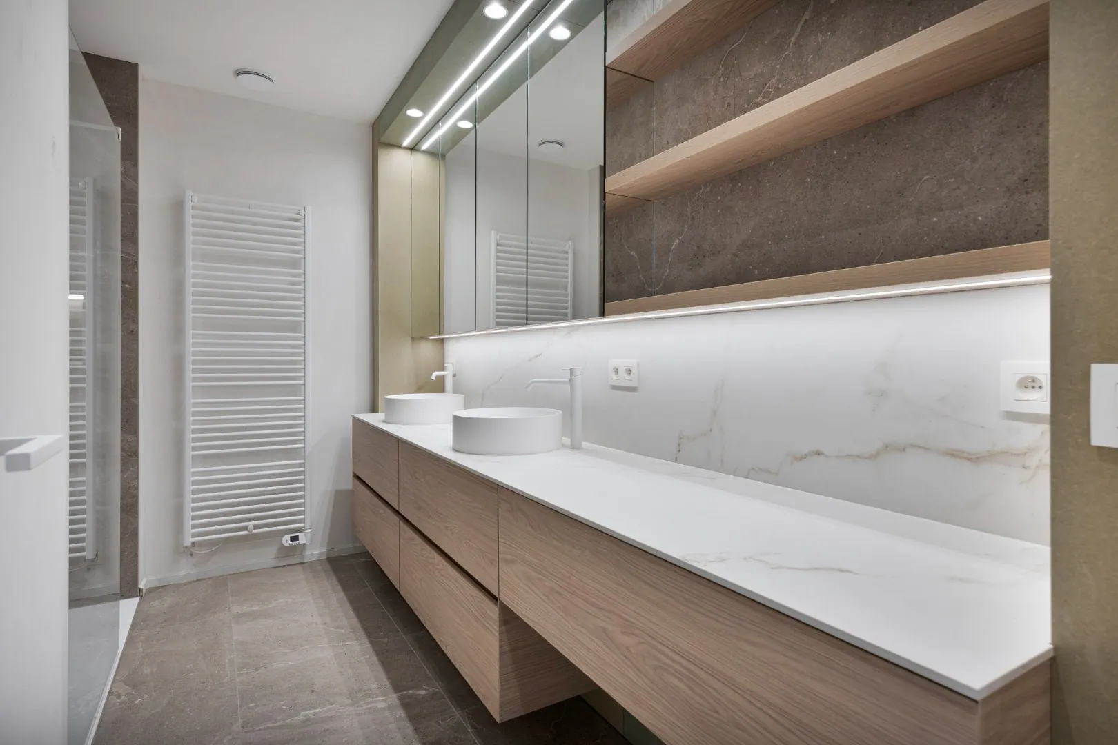 De eerste verdieping brengt ons 3 volwaardige slaapkamers, een berging voorzien van de nodige aansluitingen voor wasmachine en droogkast, een aparte toiletruimte alsook een badkamer uitgerust met inloopdouche en dubbele wastafel.